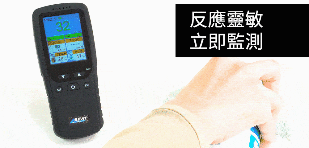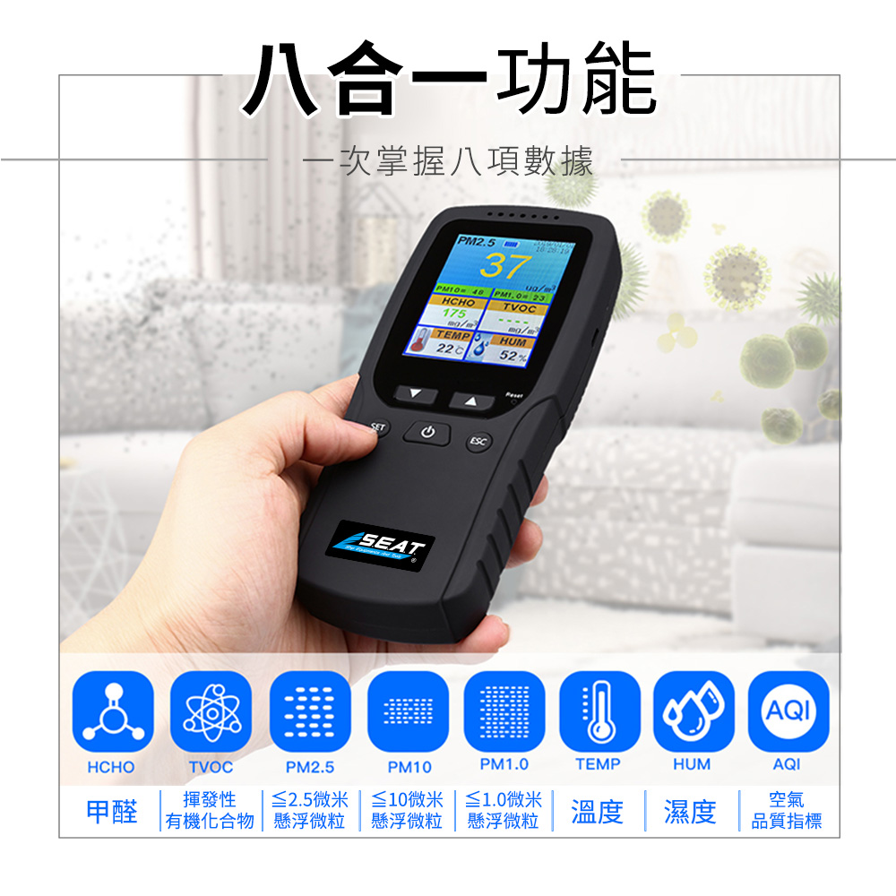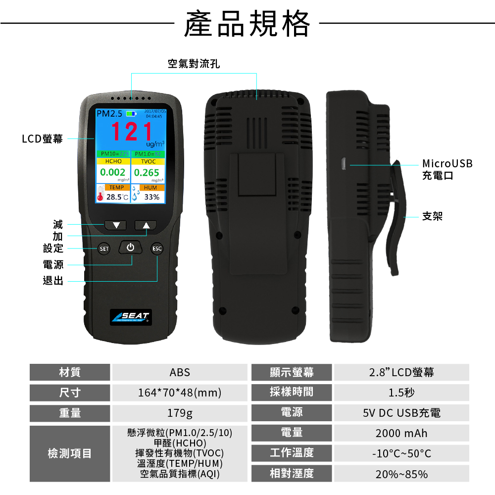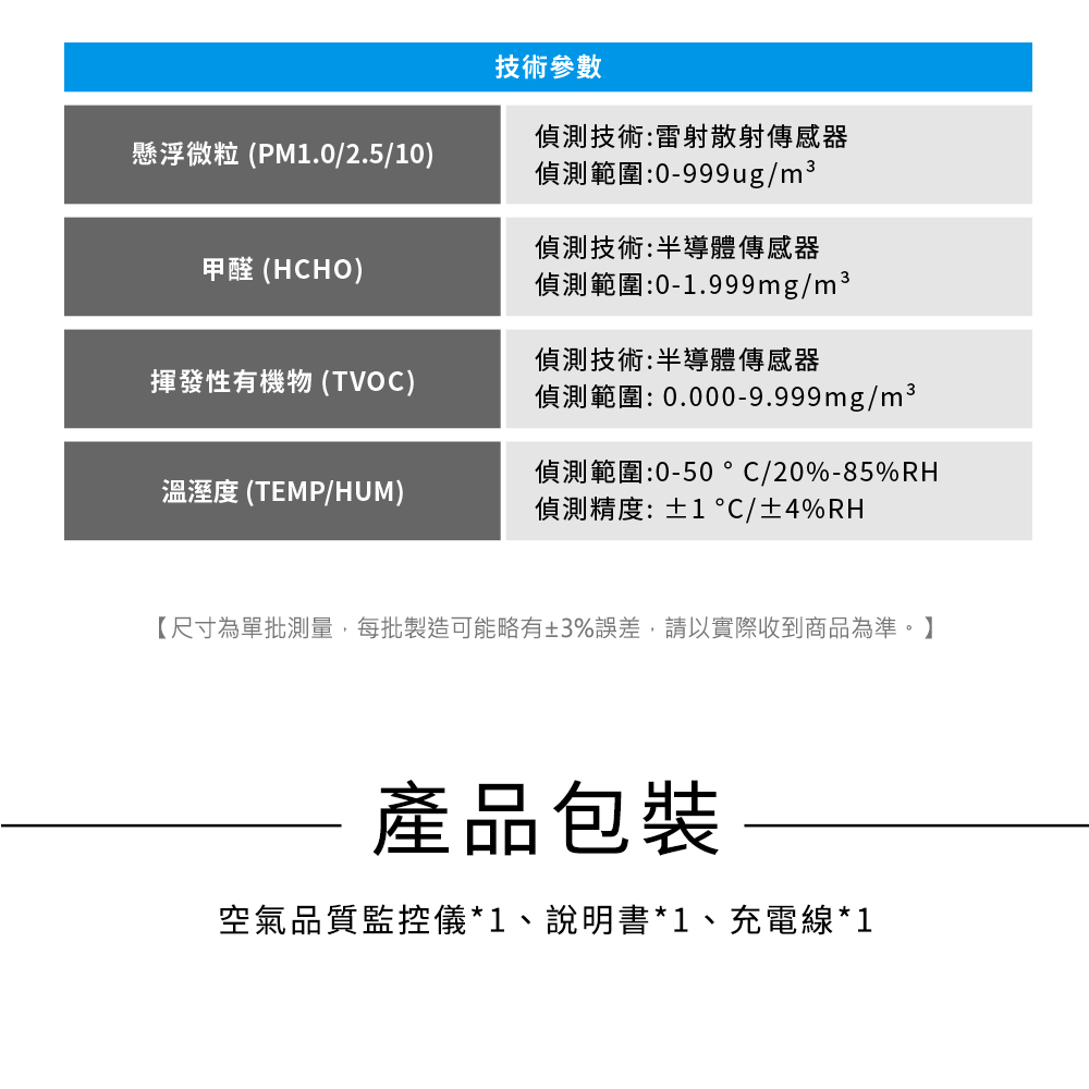 檢測項目:懸浮微粒(PM1.0/2.5/10)、甲醛(HCHO)、揮發性有機物(TVOC)、溫濕度(TEMP/HUM)、空氣品質指標(AQI)