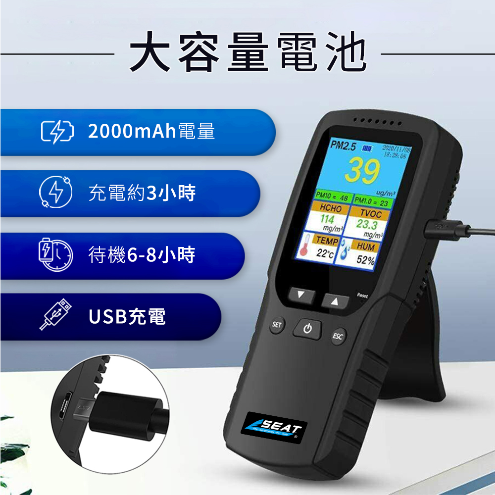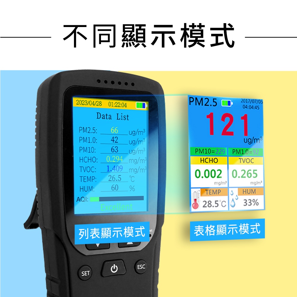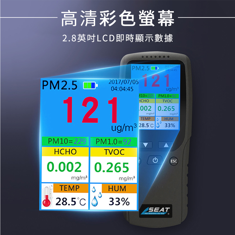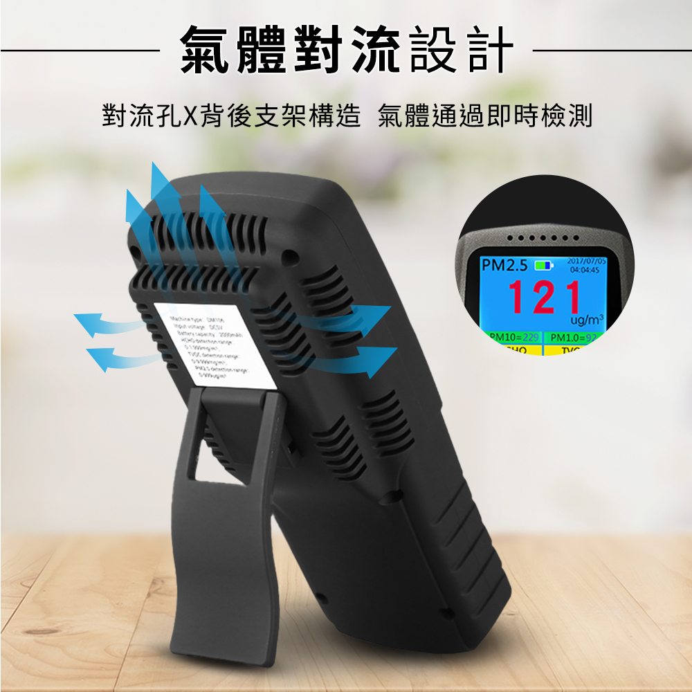 檢測項目:懸浮微粒(PM1.0/2.5/10)、甲醛(HCHO)、揮發性有機物(TVOC)、溫濕度(TEMP/HUM)、空氣品質指標(AQI)