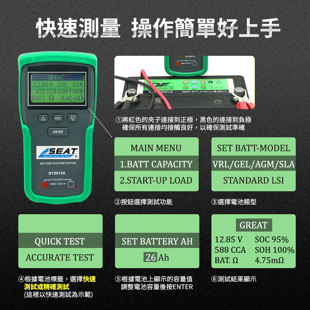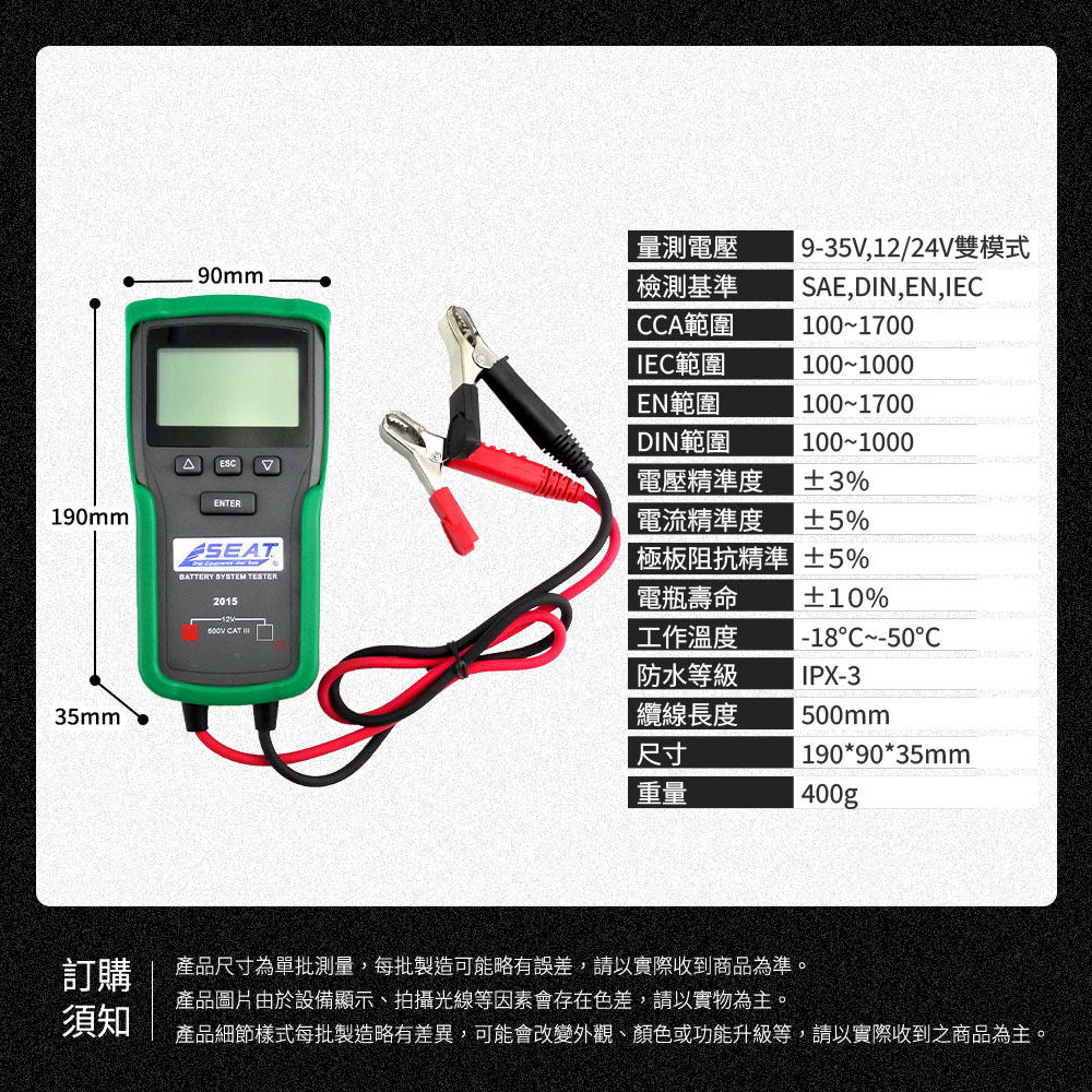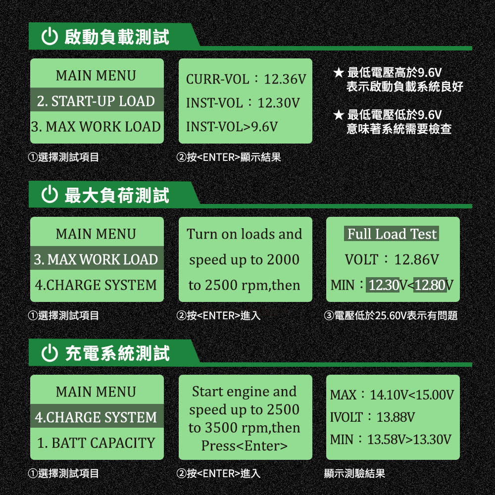 測量方式:電壓量測/電瓶極板阻抗量測/電瓶冷啟動能力CCA值量測電瓶健康狀況判定/電瓶壽命估算/啟動馬達系統負荷測試最大負載測試/充電系統測試