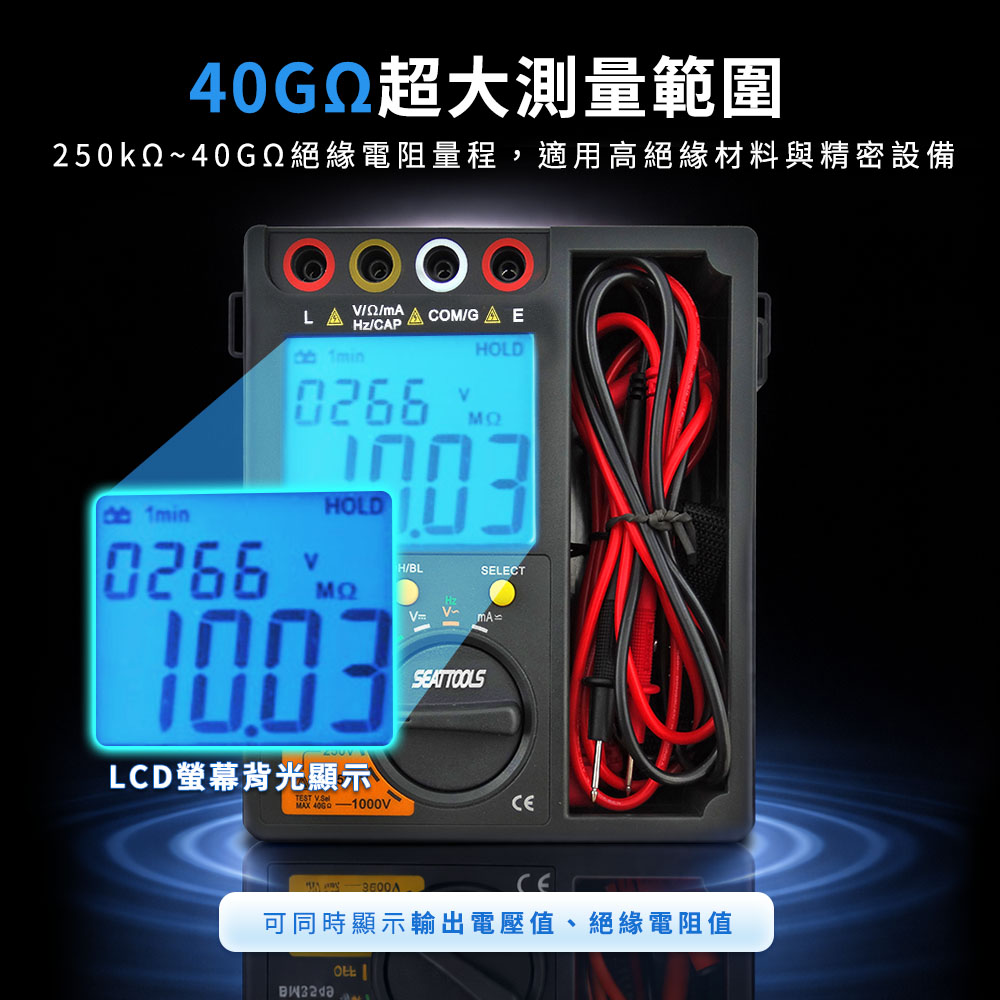 儀表測量範圍最高可達到40GΩ,可根據需要設置測量時間,測量完畢後自動保持測量結果