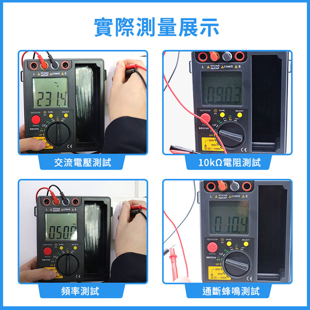 數位萬用表功能有交直流電壓、電流、電阻、電容、頻率、二極體及通斷測量等,數位萬用表功能和數位絕緣電阻測試計功能是完全分開的,在使用萬用表功能時,不必擔心會被絕緣電阻表產生的高壓電擊。