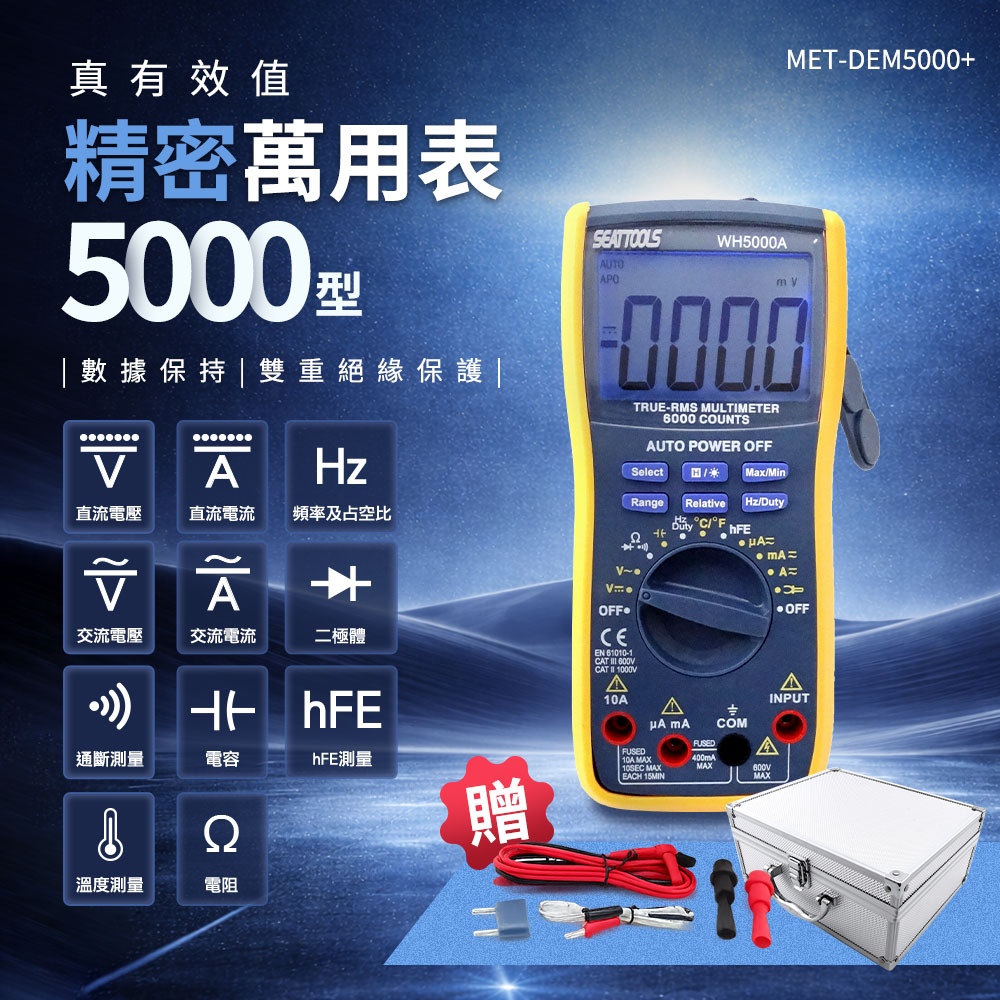 D,DE,DEM,DEM5,DEM50,DEM500,DEM5000,DEM5000+, CE,交直流電表,5999顯示,自動量程,CE歐盟認證,過載保護,高精準,全量程萬用表,直流電壓,交流電流,頻率,佔空比,二極體,通斷測量,電阻,電容,hFE測量,溫度,微安,LCD顯示,可立式腳架,鱷魚夾,錶筆,數位萬用電表,智慧型,歐姆表,大螢幕,多功能,三用,電池檢測