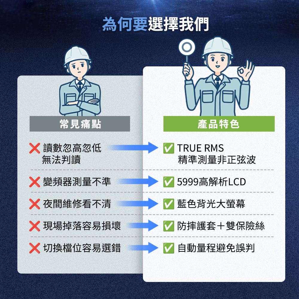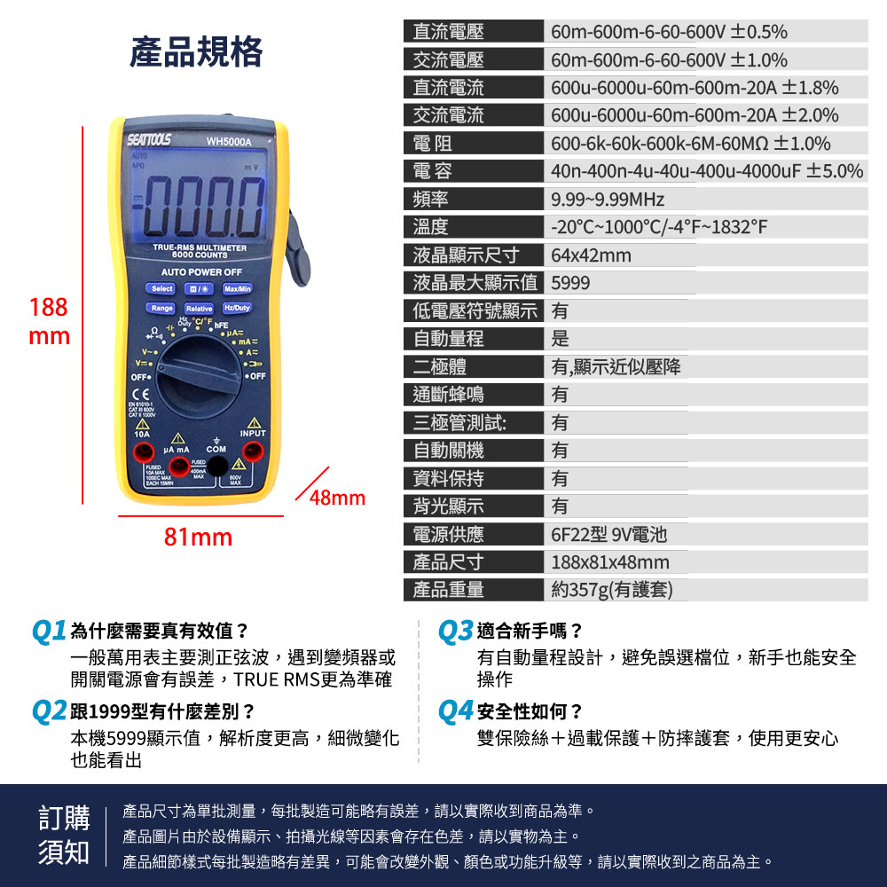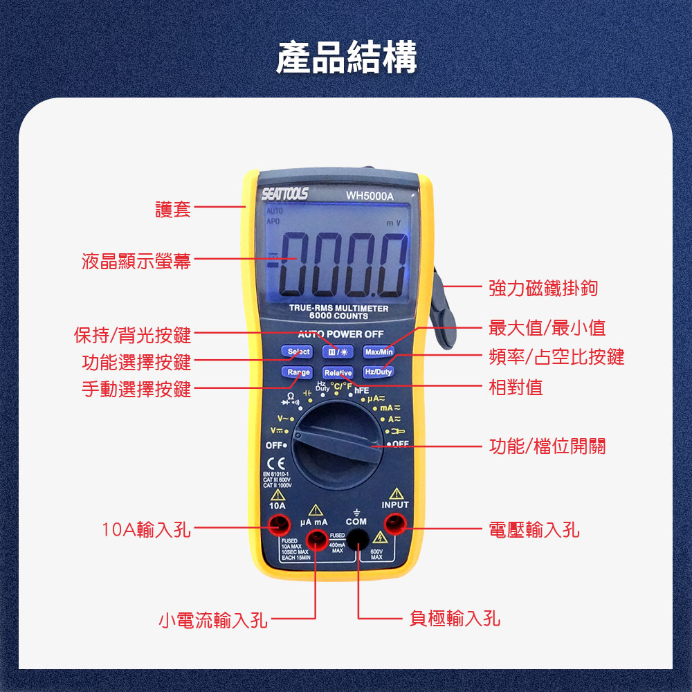 大螢幕全視角容易閱讀,藍色背光,黑暗的使用環境下可以清晰的讀數,可以將當前的測試資料保持,以便測試後讀數,可以顯示測量的最大值最小值,配備護套,防摔,具有溫度測試功能,雙保險絲設計,安全性更高。