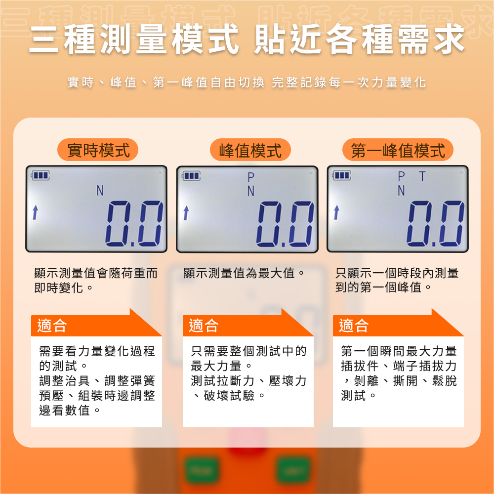 - 即時值、峰值保持、連續測試自由切換。