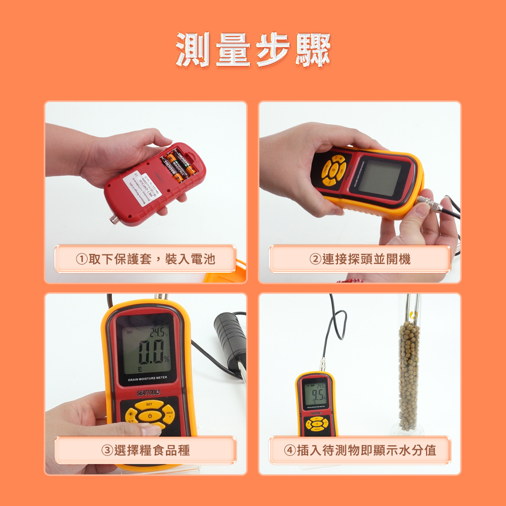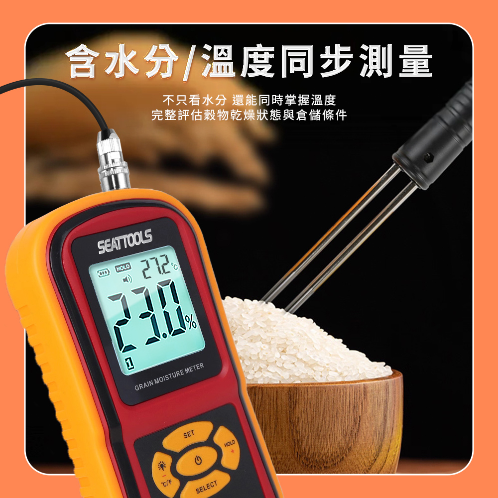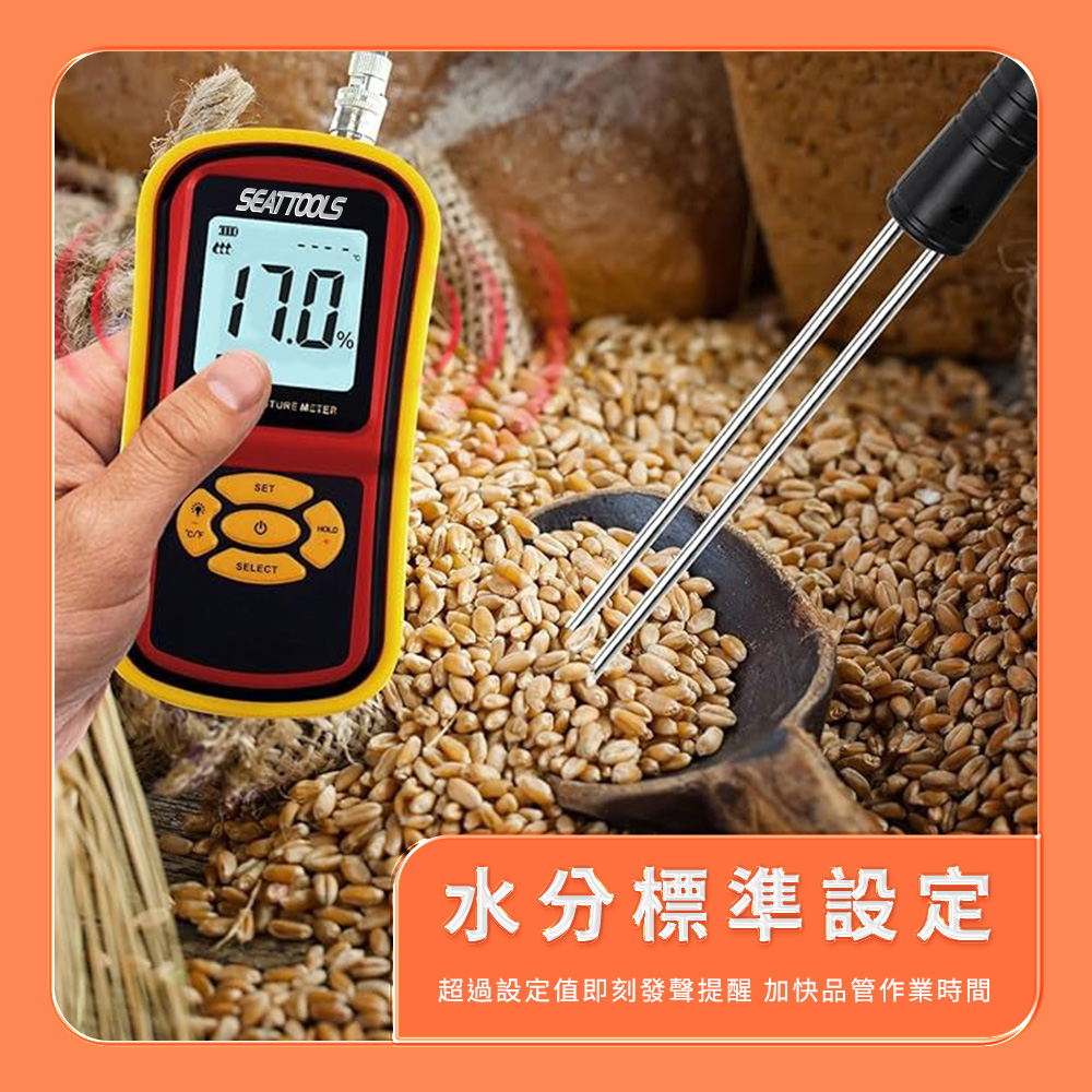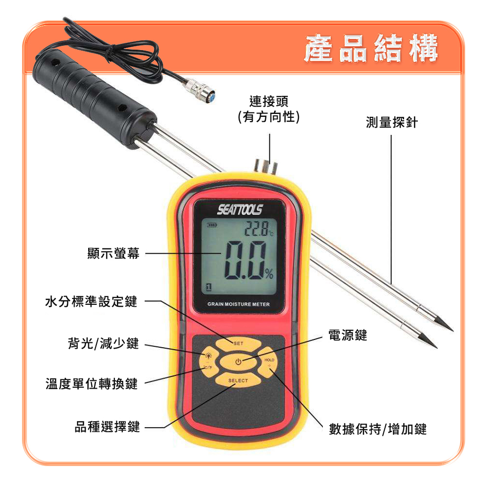 測量範圍:水分:5%-30%/溫度:-1°C-60°C