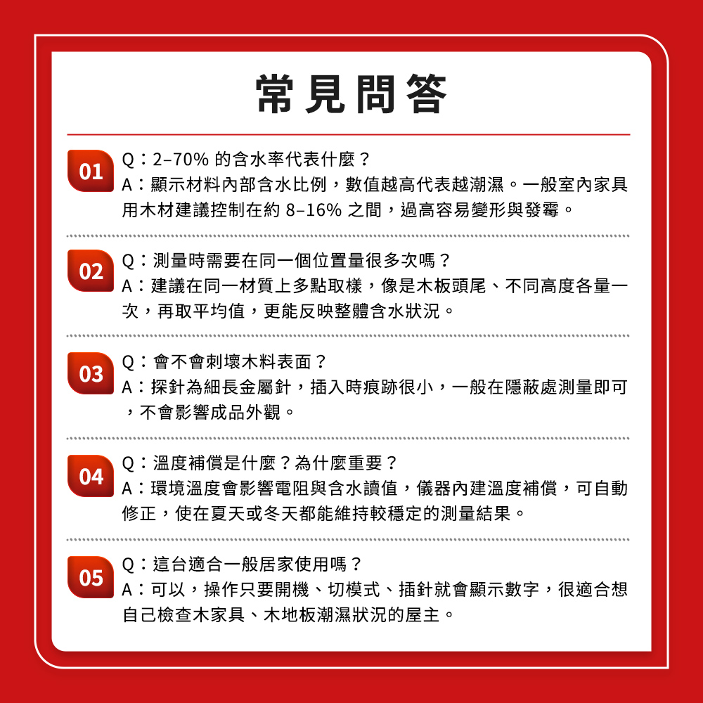 A5:可以,操作只要開機、切模式、插針就會顯示數字,很適合想自己檢查木家具、木地板潮濕狀況的屋主。