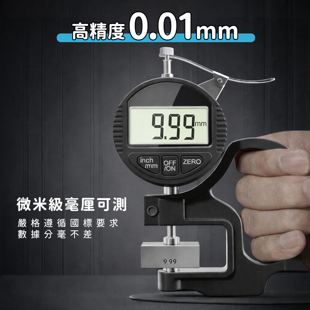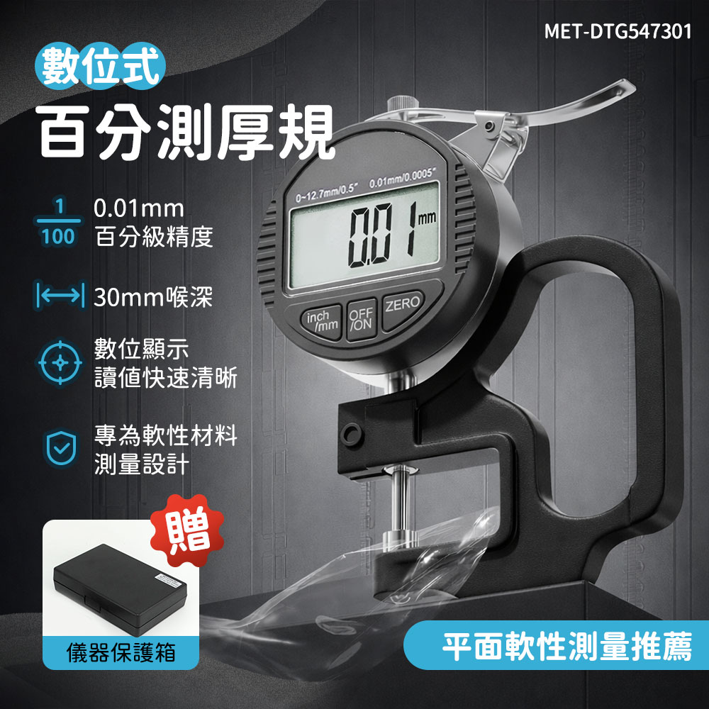 MET-DTG547301數位式百分測厚規,量程0~12.7mm,精度高達0.01mm,專為皮革、海綿、紙張與布料設計。鋁殼體搭配ABS罩殼結構穩固耐用,喉深30mm設計可測更深入位置,數位顯示清晰快速讀值,讓品管與生產不再靠感覺判斷。