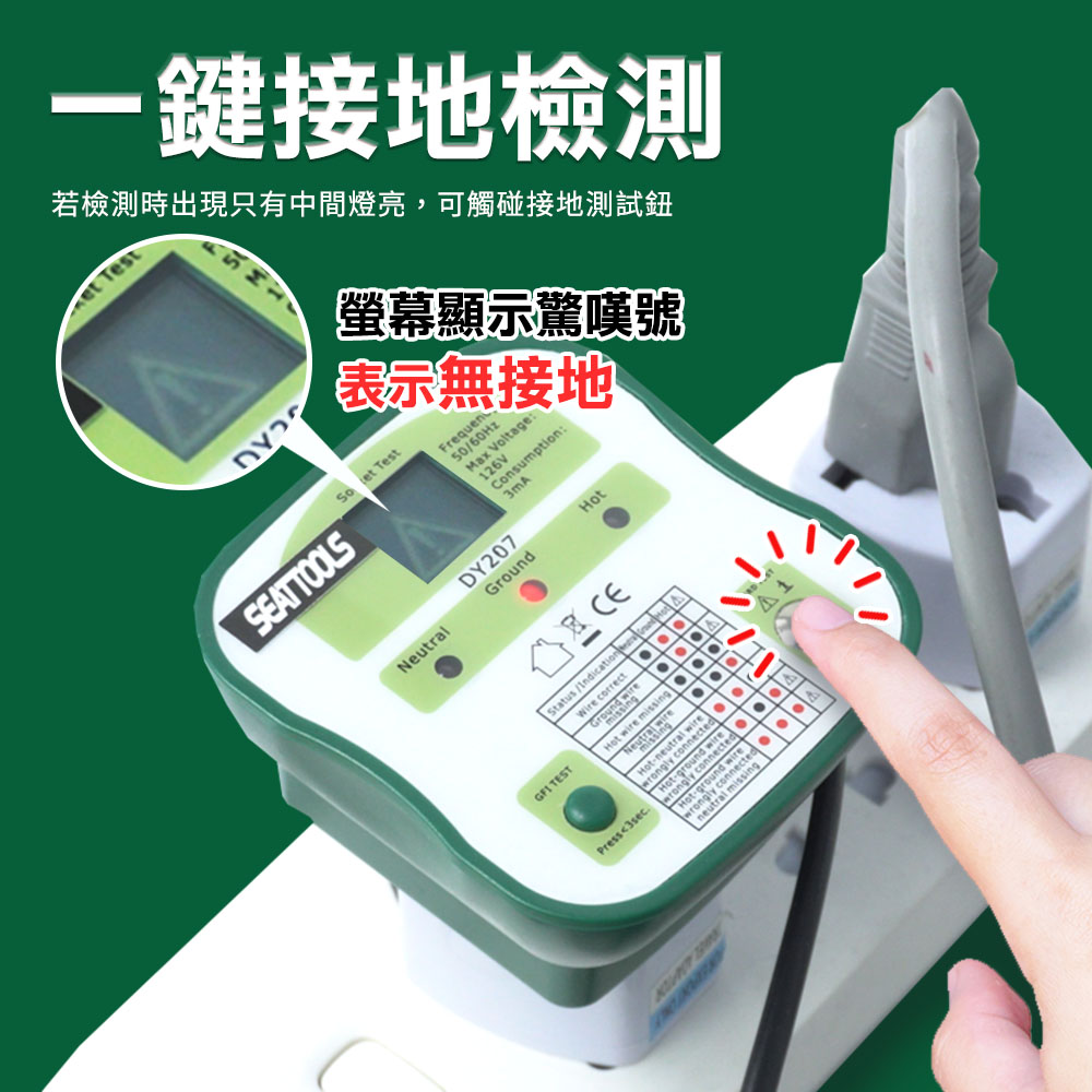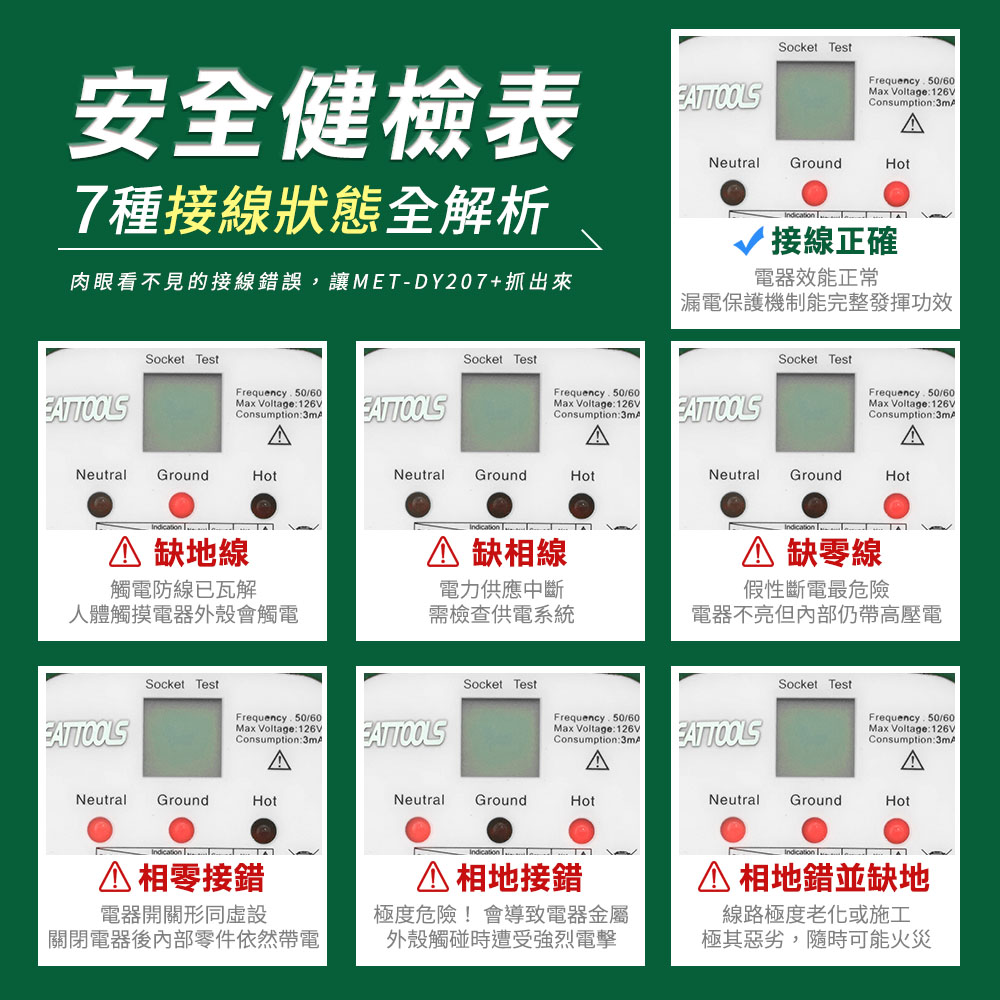 您知道家裡的插座可能接錯線,甚至根本沒接地嗎?MET-DY207+ 不只是測試器,更是插座的健檢專家。搭載高解析液晶螢幕,直觀顯示電壓與接線狀態;一鍵模擬 30mA 漏電跳脫,確保家中保護裝置非擺飾。輕巧 40g 卻具備 300V過壓保護,不論是老屋改裝、租屋點交或精密儀器安裝,只需秒速一插,安全隱患無所遁形。
