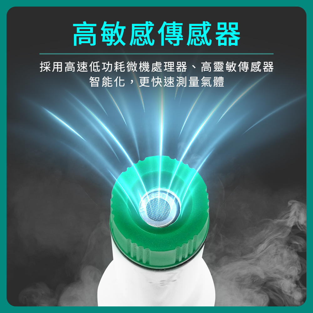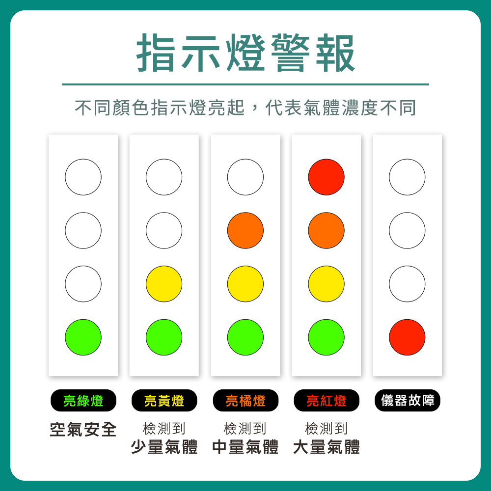 • 四色LED燈顯示:綠、黃、橙、紅燈依濃度警示,直覺安全判讀。