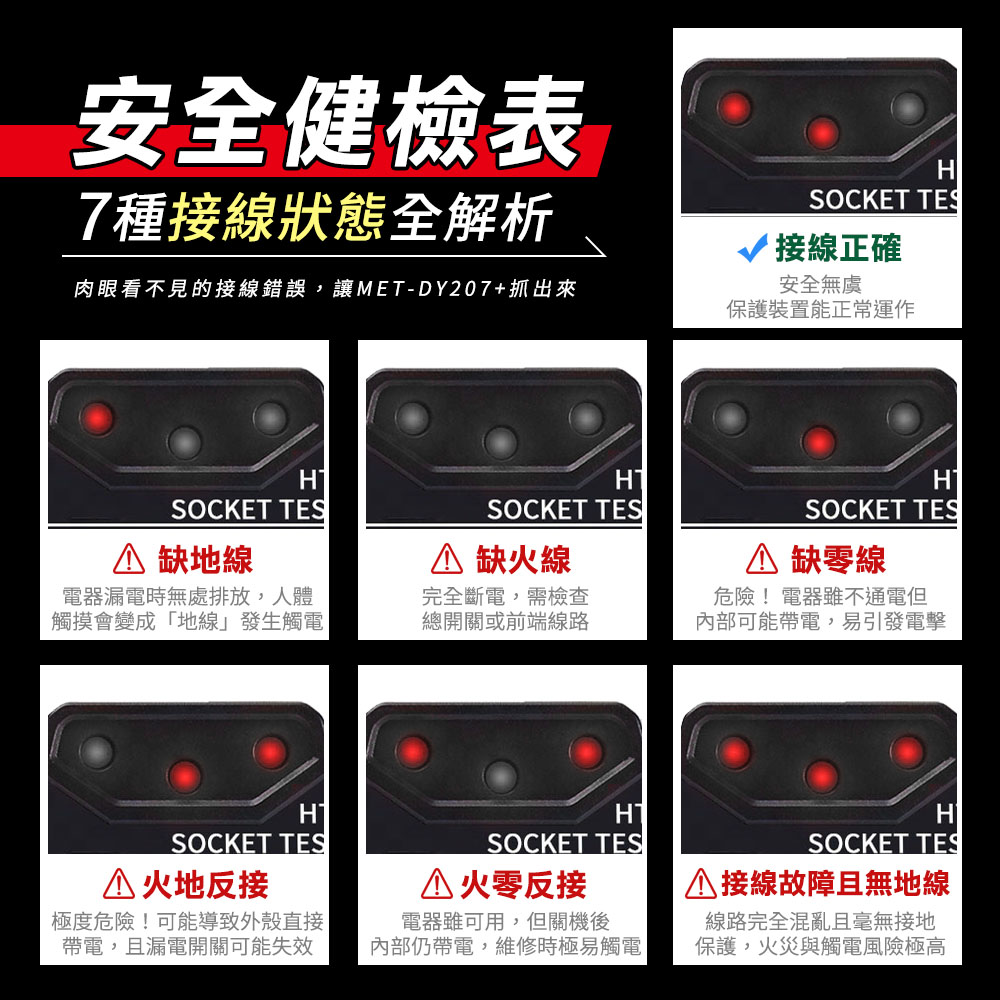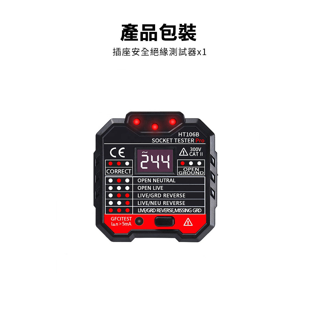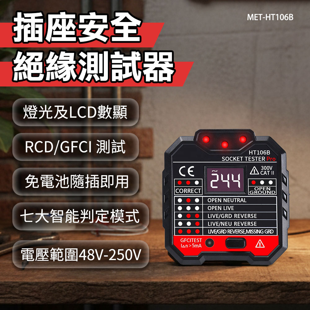 MET-HT106B_插座安全絕緣測試器(100V~250V)<br>看不見的插座接線錯誤,是電線走火與觸電的無形殺手!MET-HT106B 插座測試器 專為守護安全而生,搭載液晶電壓顯示與七大故障模式判讀。不論是裝修驗收、老屋檢測或日常維護,只要一插,漏電保護與接線正確性立即現形。小巧專業,讓居家安全不再憑感覺,給家人最實質的電力防護。