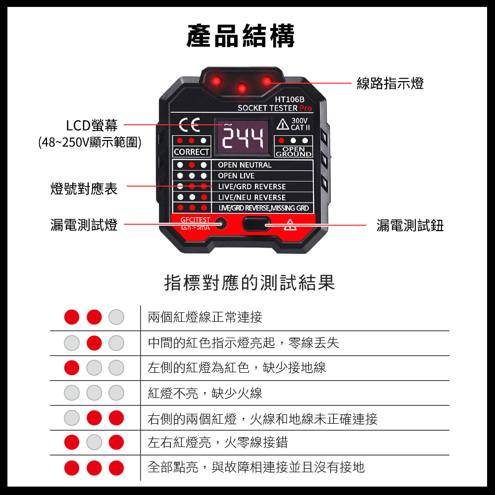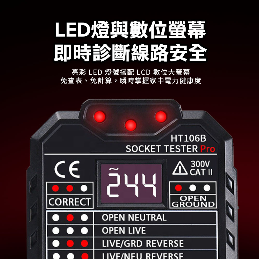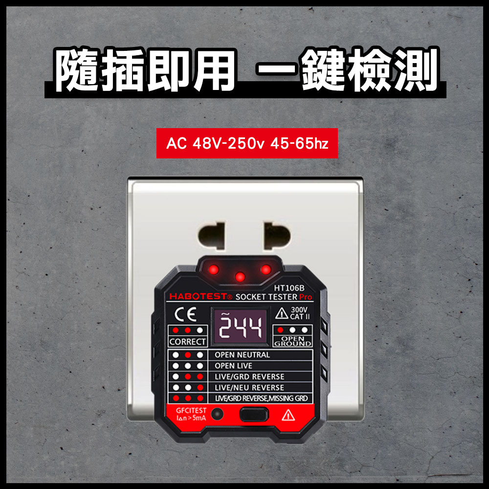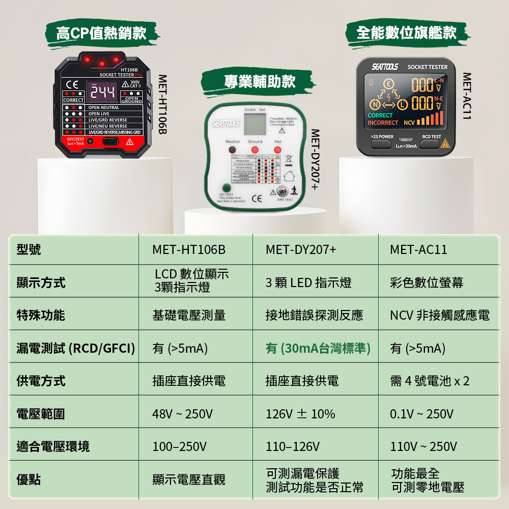 MET-HT106B_插座安全絕緣測試器(100V~250V)<br>看不見的插座接線錯誤,是電線走火與觸電的無形殺手!MET-HT106B 插座測試器 專為守護安全而生,搭載液晶電壓顯示與七大故障模式判讀。不論是裝修驗收、老屋檢測或日常維護,只要一插,漏電保護與接線正確性立即現形。小巧專業,讓居家安全不再憑感覺,給家人最實質的電力防護。