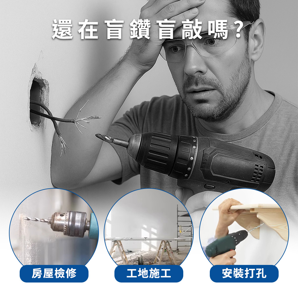 裝修打孔最怕「一鑽致命」:打到電線跳電、誤傷水管滲水、掛畫釘不穩。牆體探測器整合木樑、金屬與電線偵測,牆掛/裝修/弱電施工都能快速判斷。鑽孔前先掃描,安心不補牆!