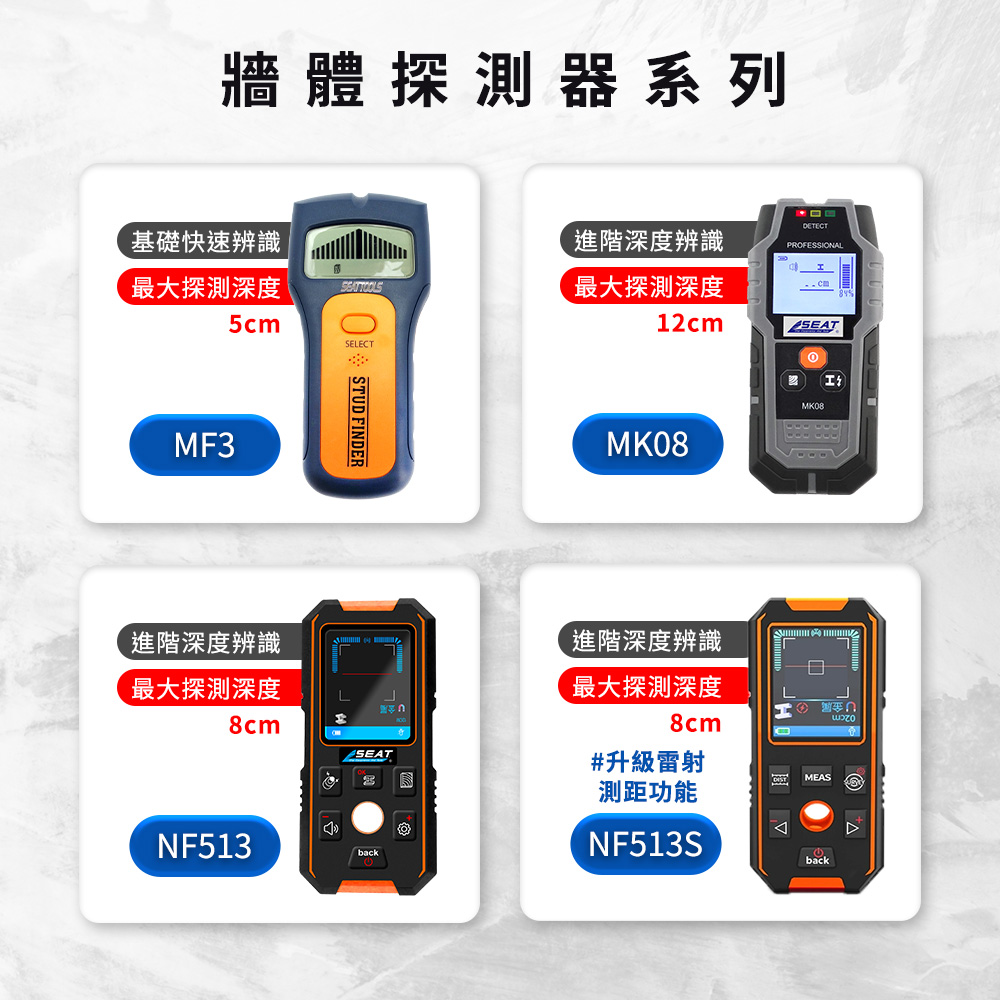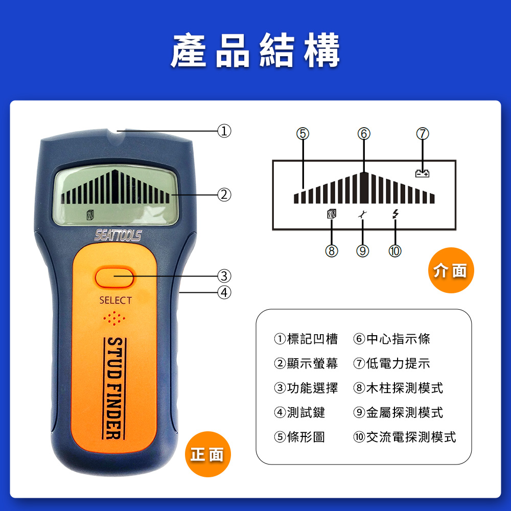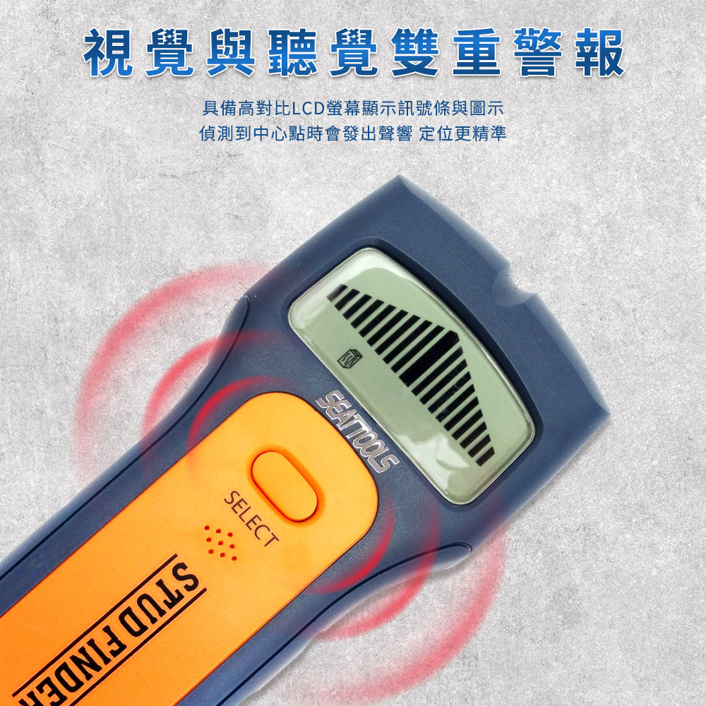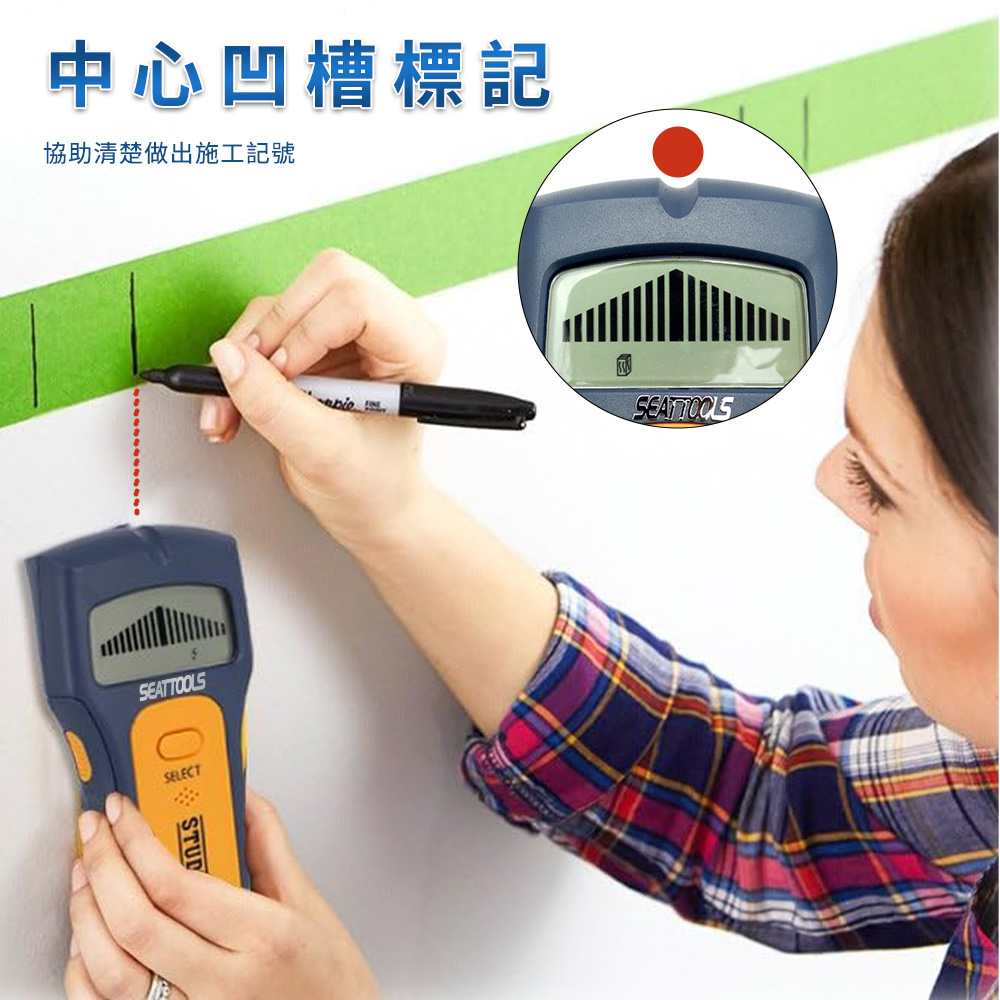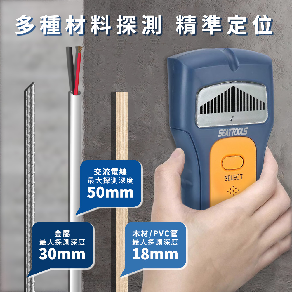 - 三合一偵測:木材、金屬、電線一鍵切換