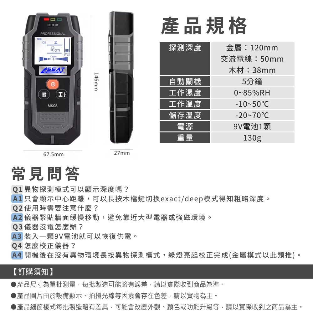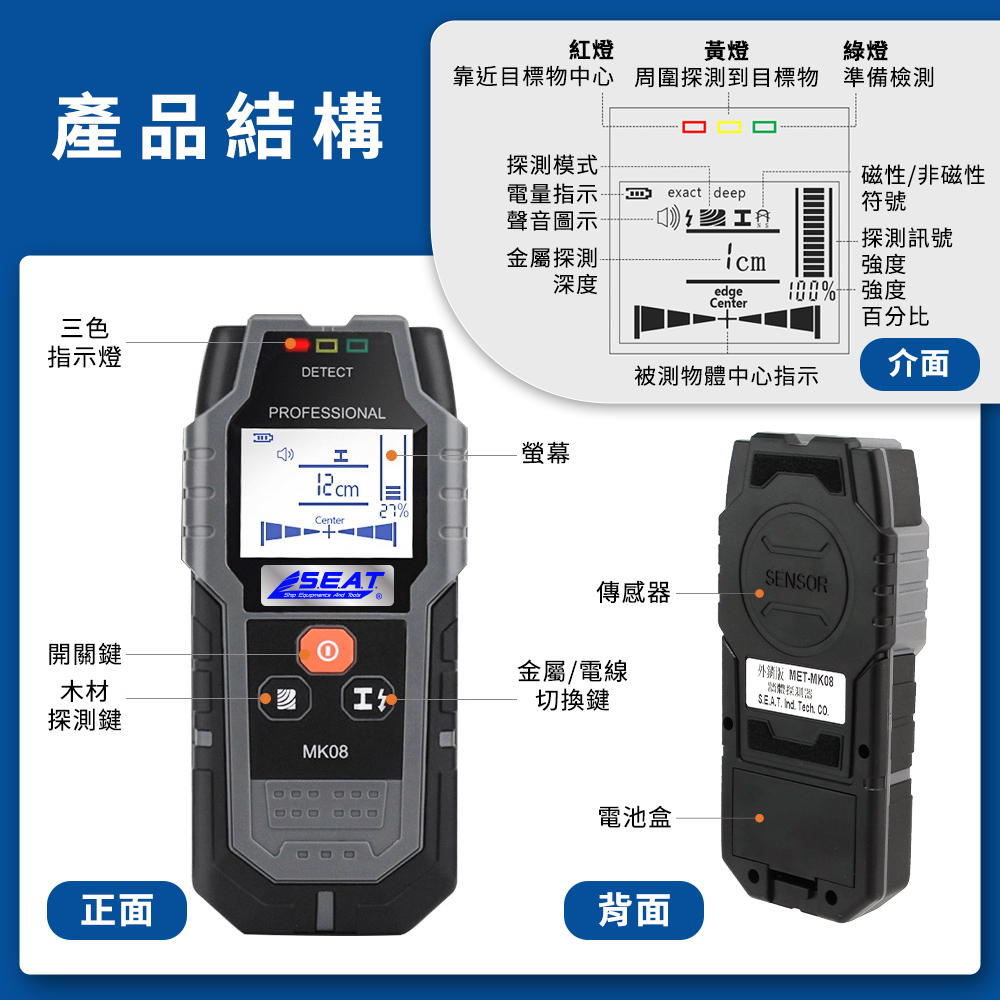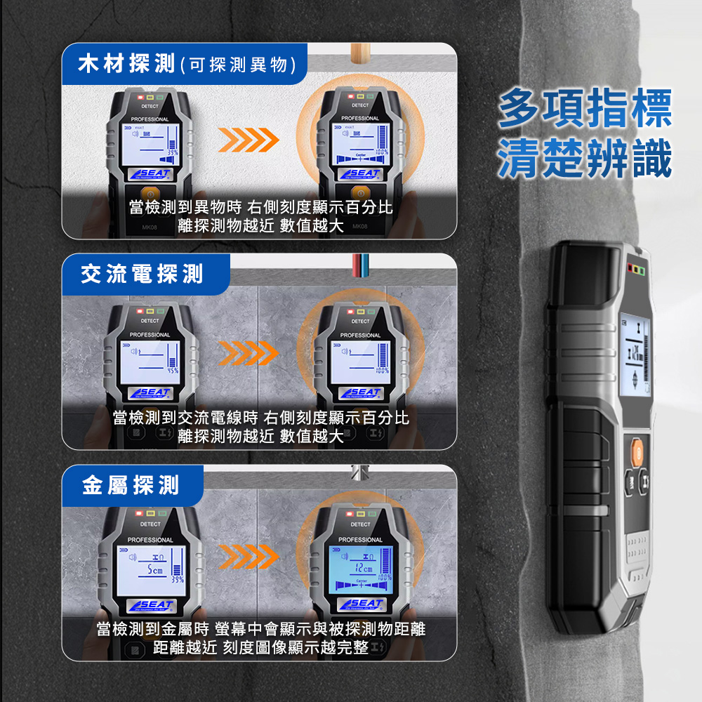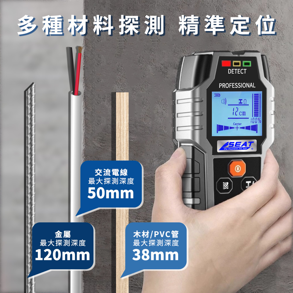 - 三合一偵測:木材、金屬、電線一鍵切換