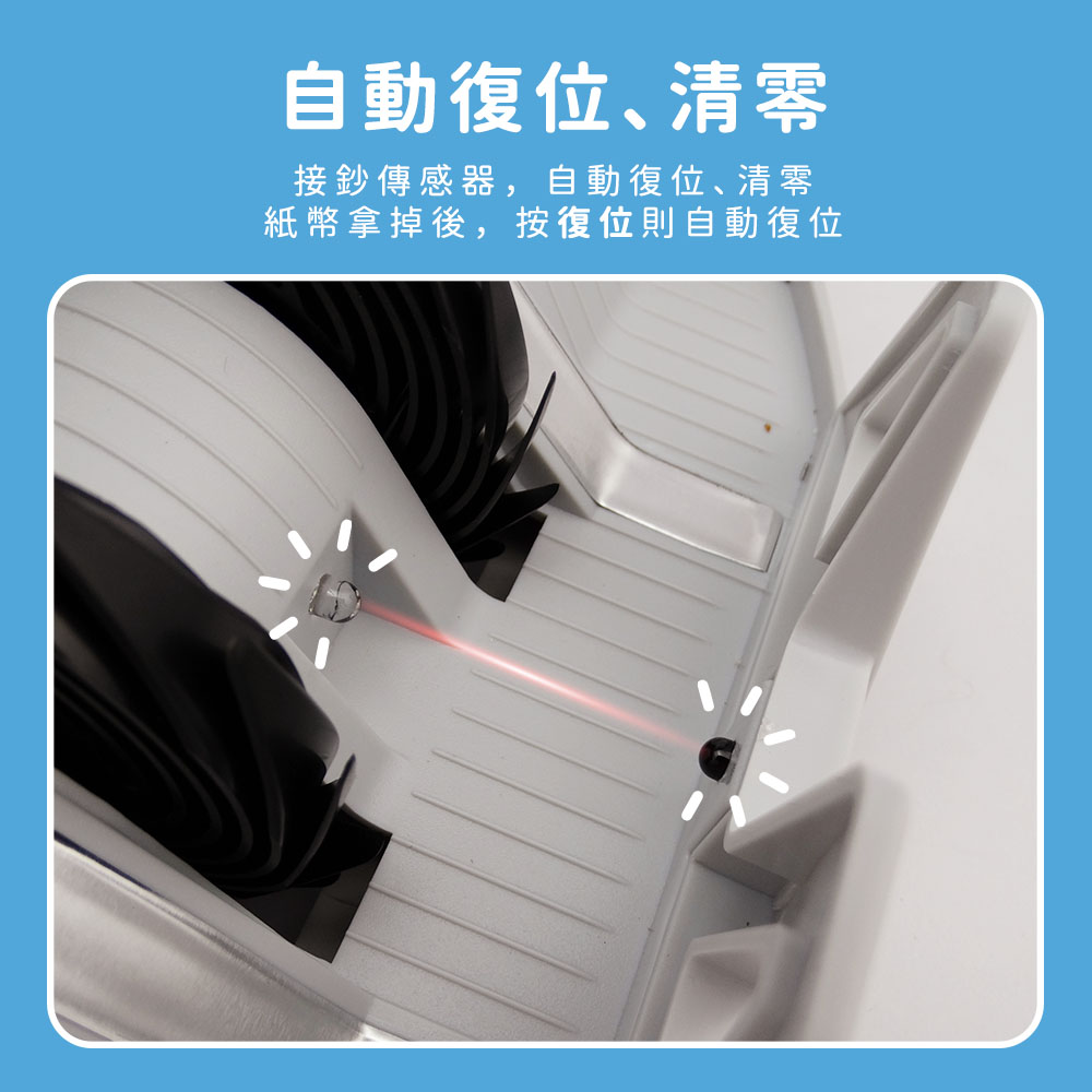 -接鈔傳感器,自動復位、清零,紙幣拿掉後,按復位則自動復位。