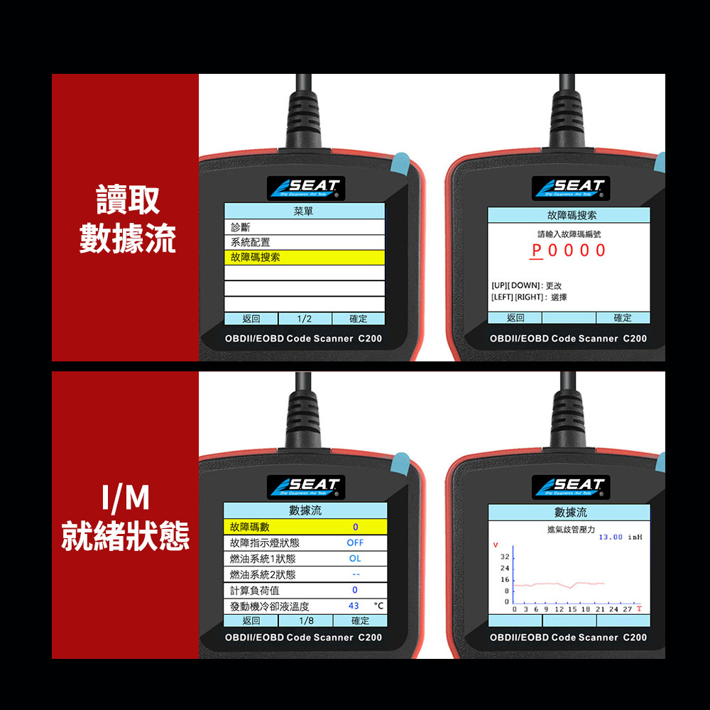 氧傳感器測試、零部件測試、彩色大屏顯示、壓燃點火監視、燃油系統監視、綜合部件監視、失火監視、催化器監視、二次空氣噴射系統監視、燃油蒸氣系統監視、發動機冷卻異體溫度、計算負荷值。