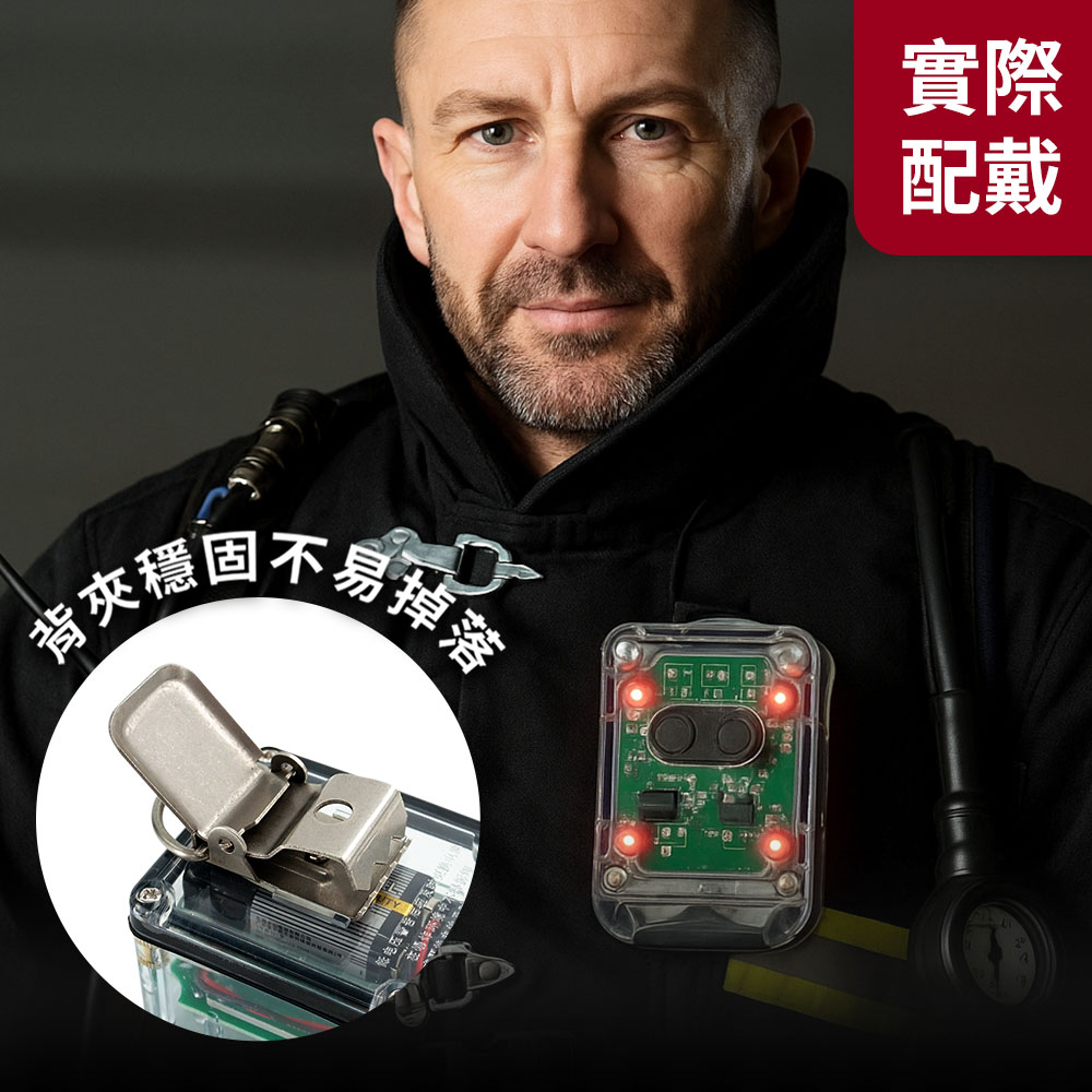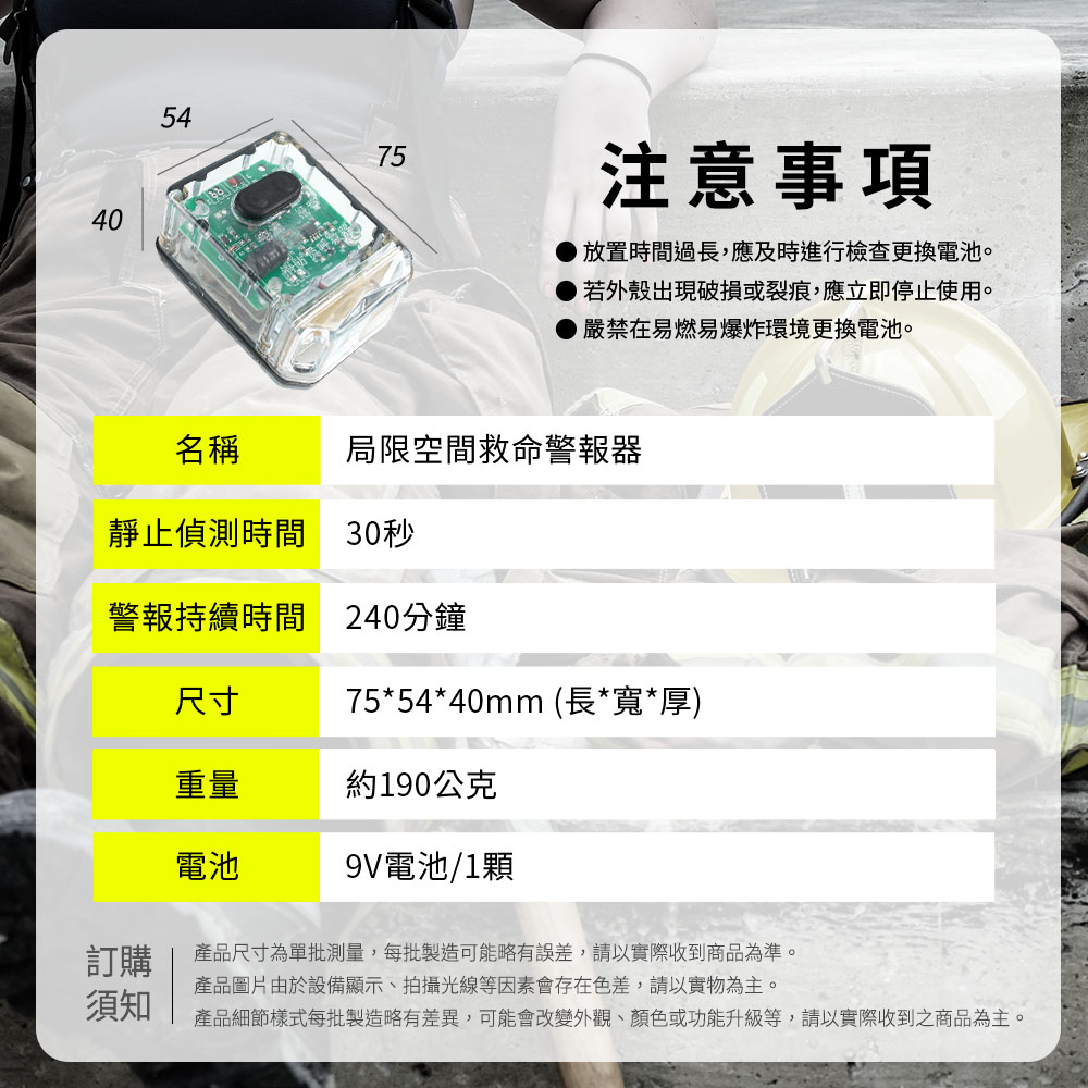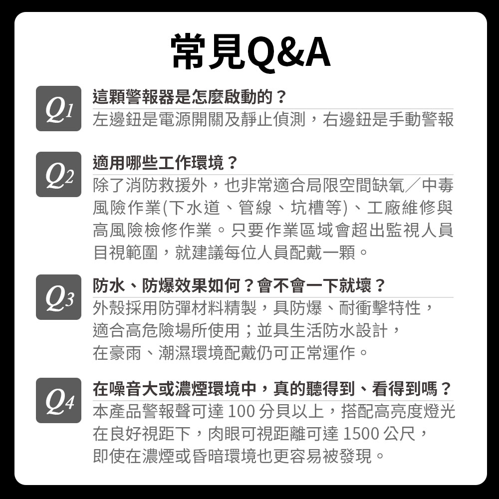 每位人員進入作業都要攜帶一顆,可偵測人體的器具,當佩帶人員活動停止30秒時會自動啟動高分貝聲光警報聲