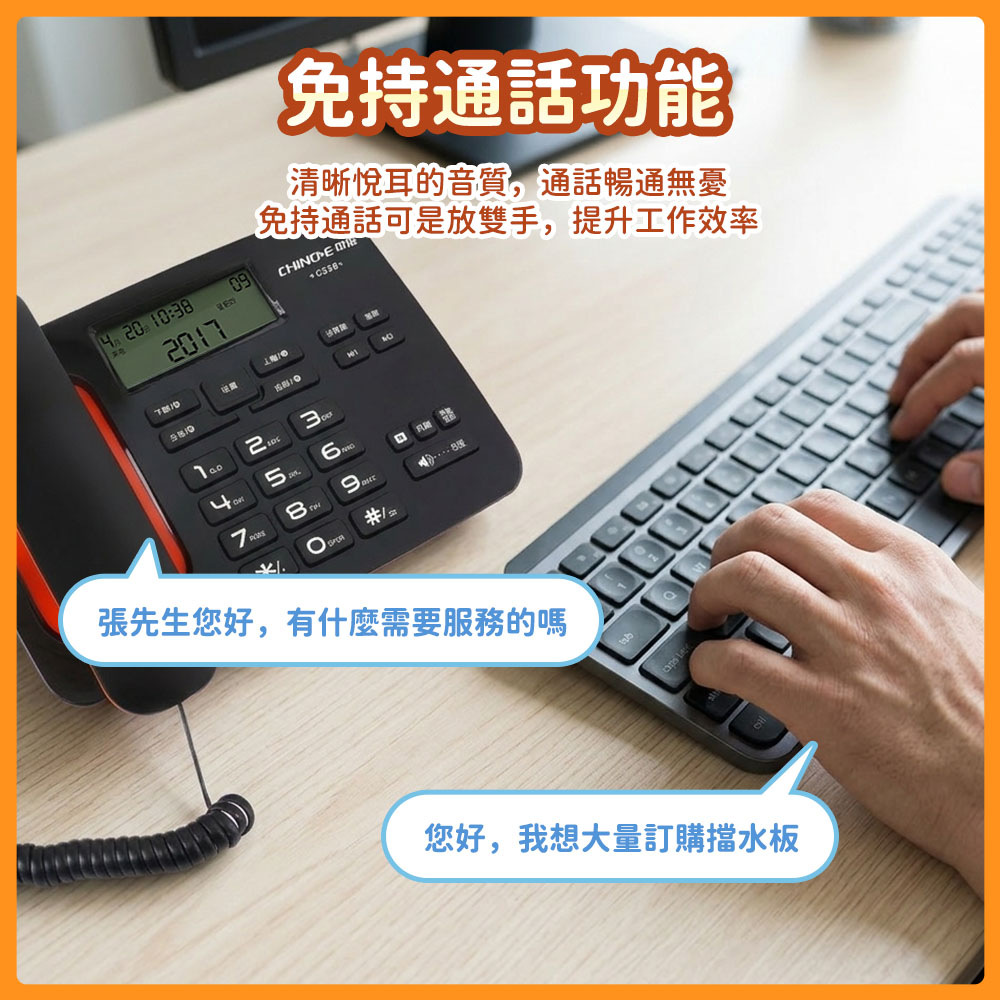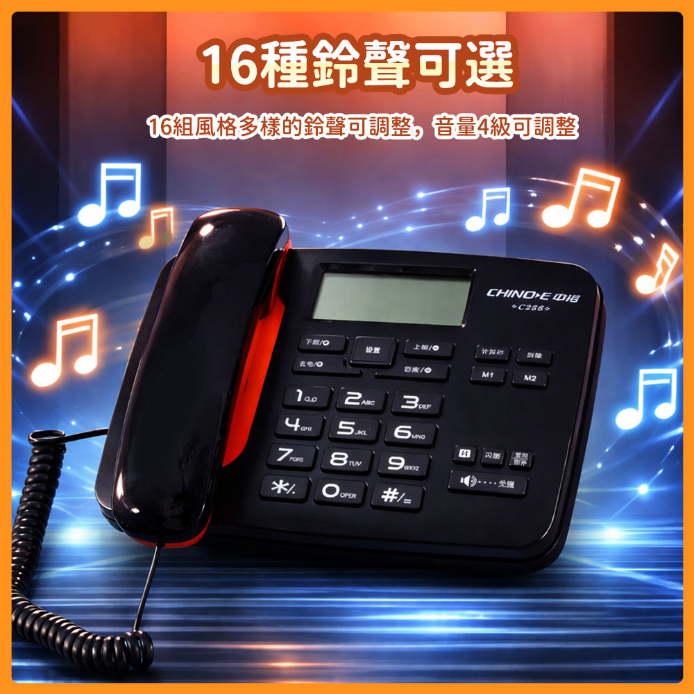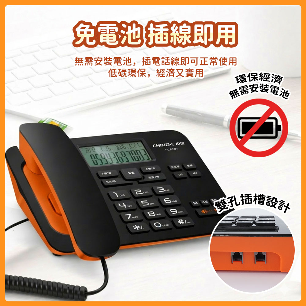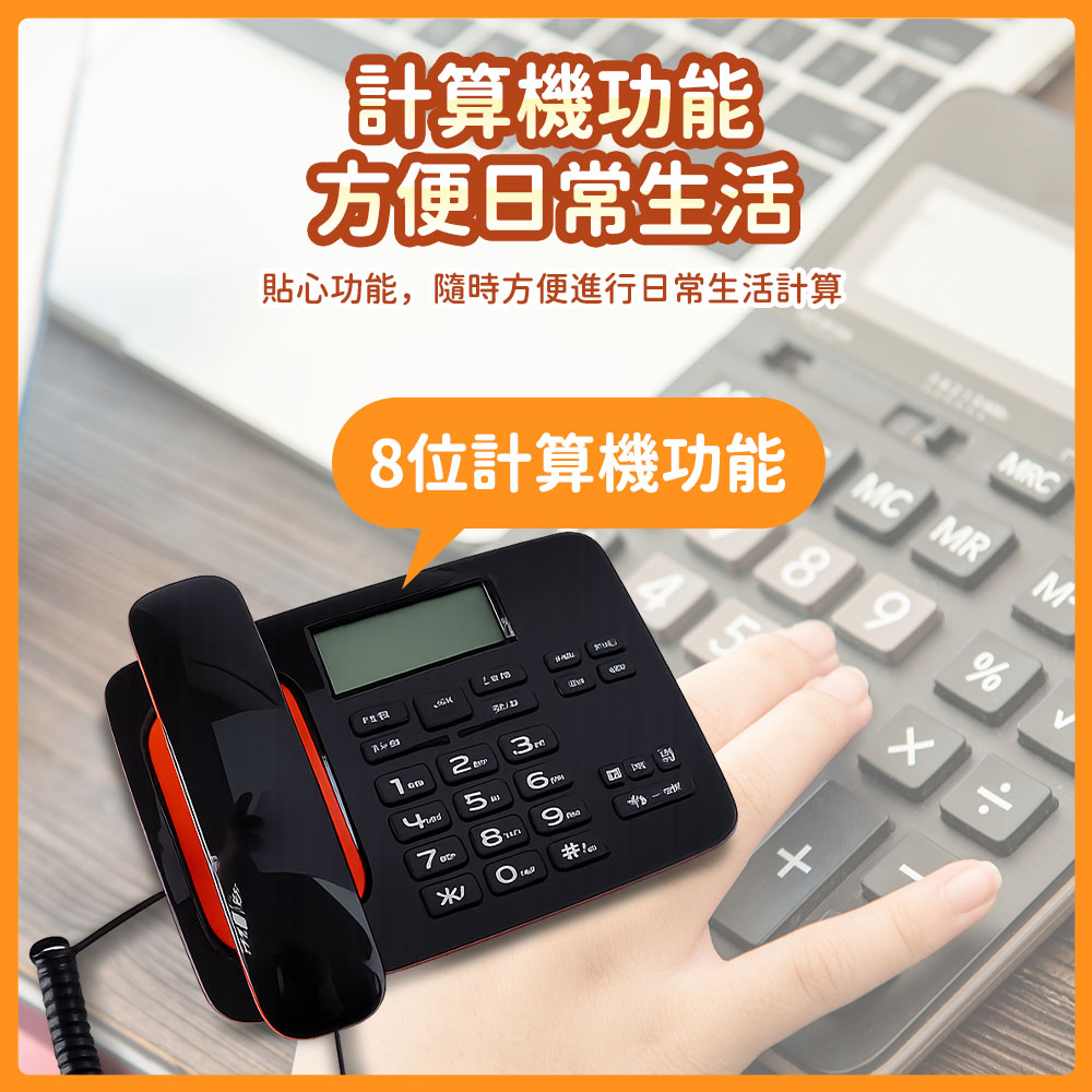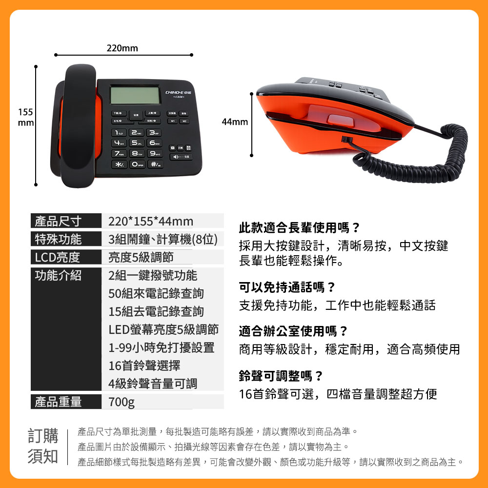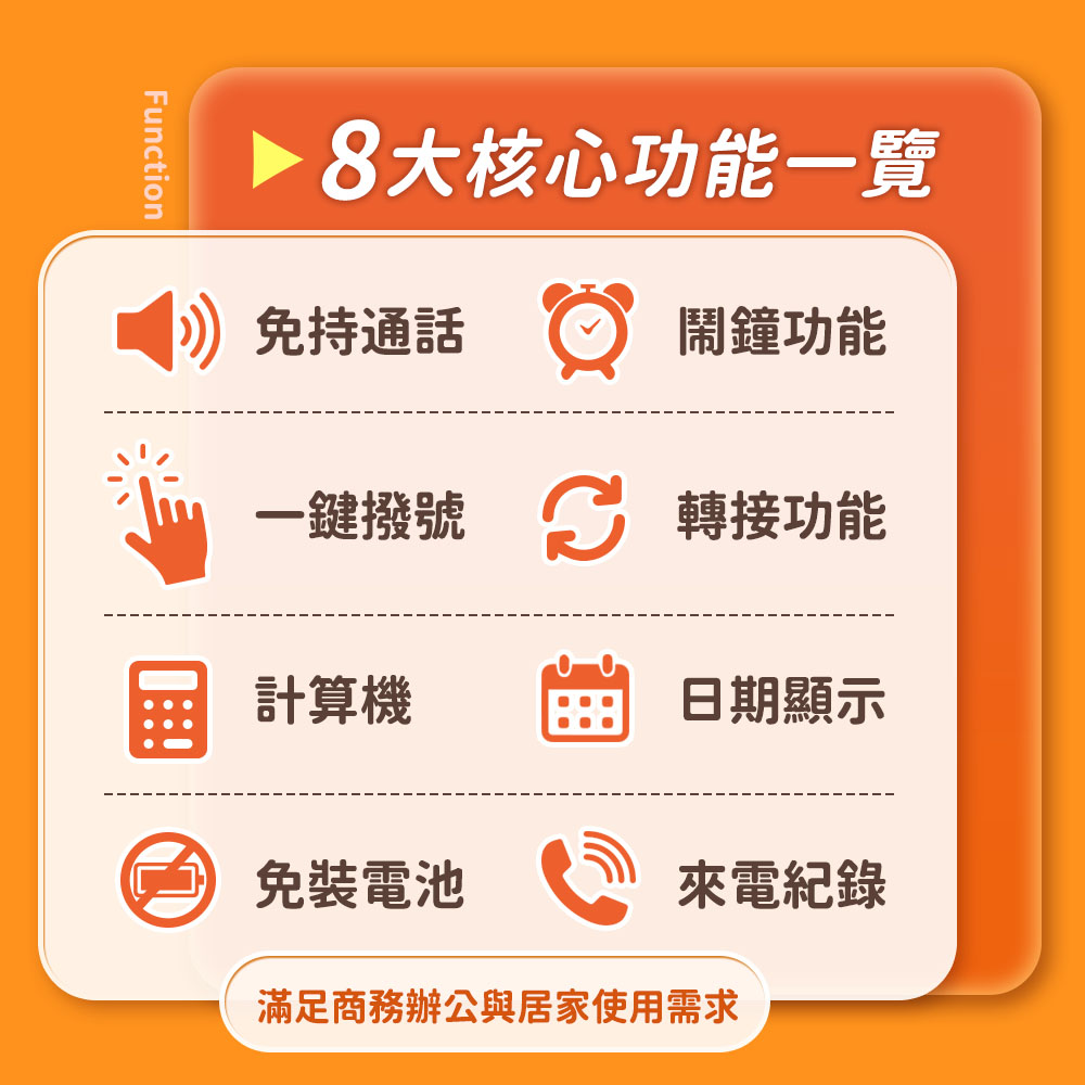 可互打分機號碼,與接聽保留功能,方便又快速,機身採用ABS材質,舒適質感、大按鍵且耐磨清晰,擁有大容量儲存,16首鈴聲選擇且有鬧鐘功能。