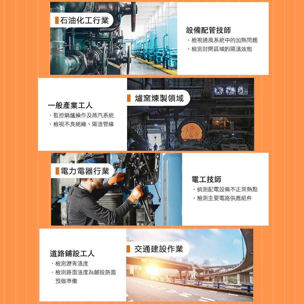 HVAC/空調系統:冷氣出風口、冷凝器、管線的溫度差測量,評估效能。
