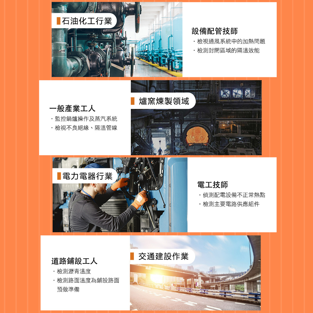 HVAC/空調系統:冷氣出風口、冷凝器、管線的溫度差測量,評估效能。