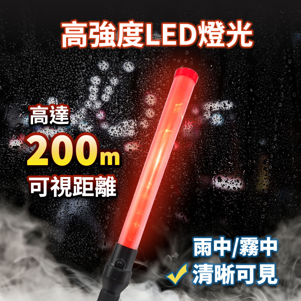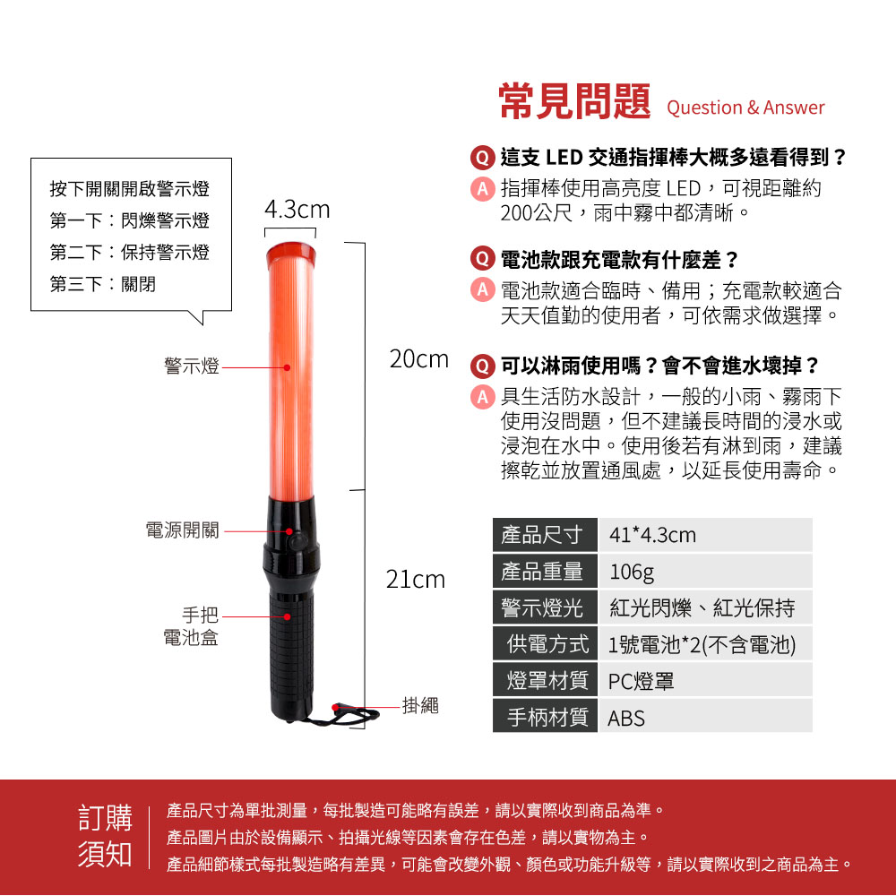 適用於交通指揮、動線引導,PC燈罩材質經久耐用,高亮度LED燈光,下雨起霧都能清楚看見,電池式連續值勤不中斷,手把旋開放入電池即可使用。