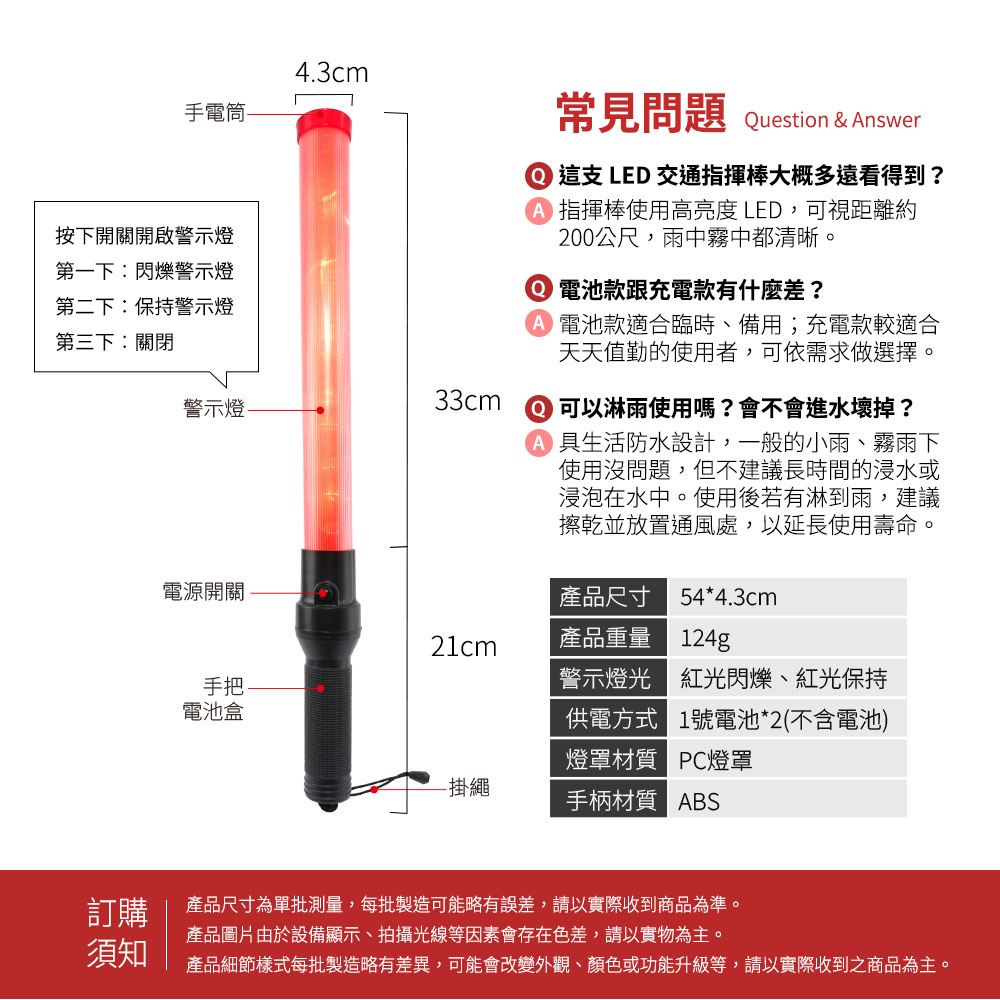 適用於交通指揮、動線引導,PC燈罩材質經久耐用,高亮度LED燈光,下雨起霧都能清楚看見,電池式連續值勤不中斷,手把旋開放入電池即可使用。