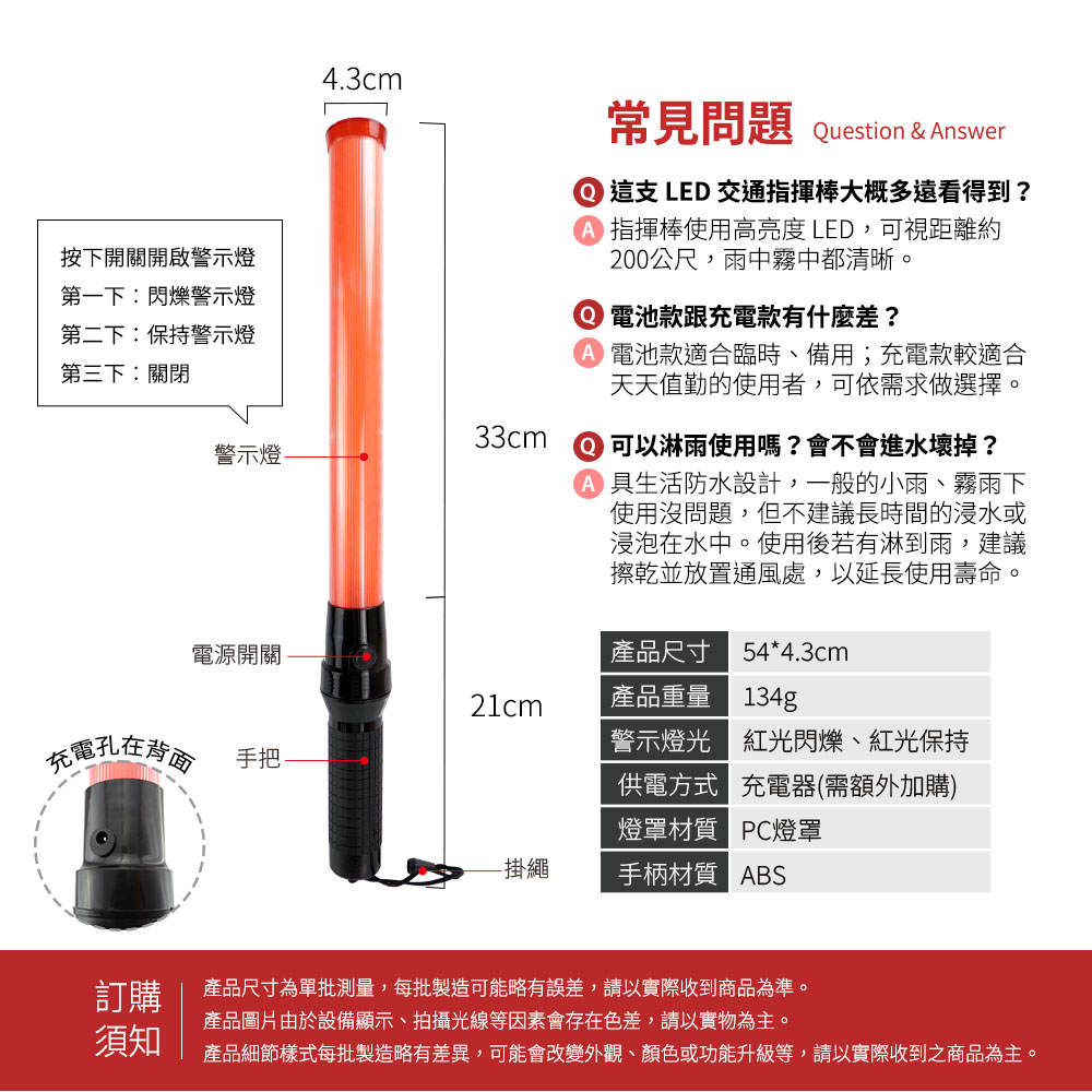 適用於交通指揮、動線引導,PC燈罩材質經久耐用,高亮度LED燈光,下雨起霧都能清楚看見,電池式連續值勤不中斷,手把旋開放入電池即可使用。