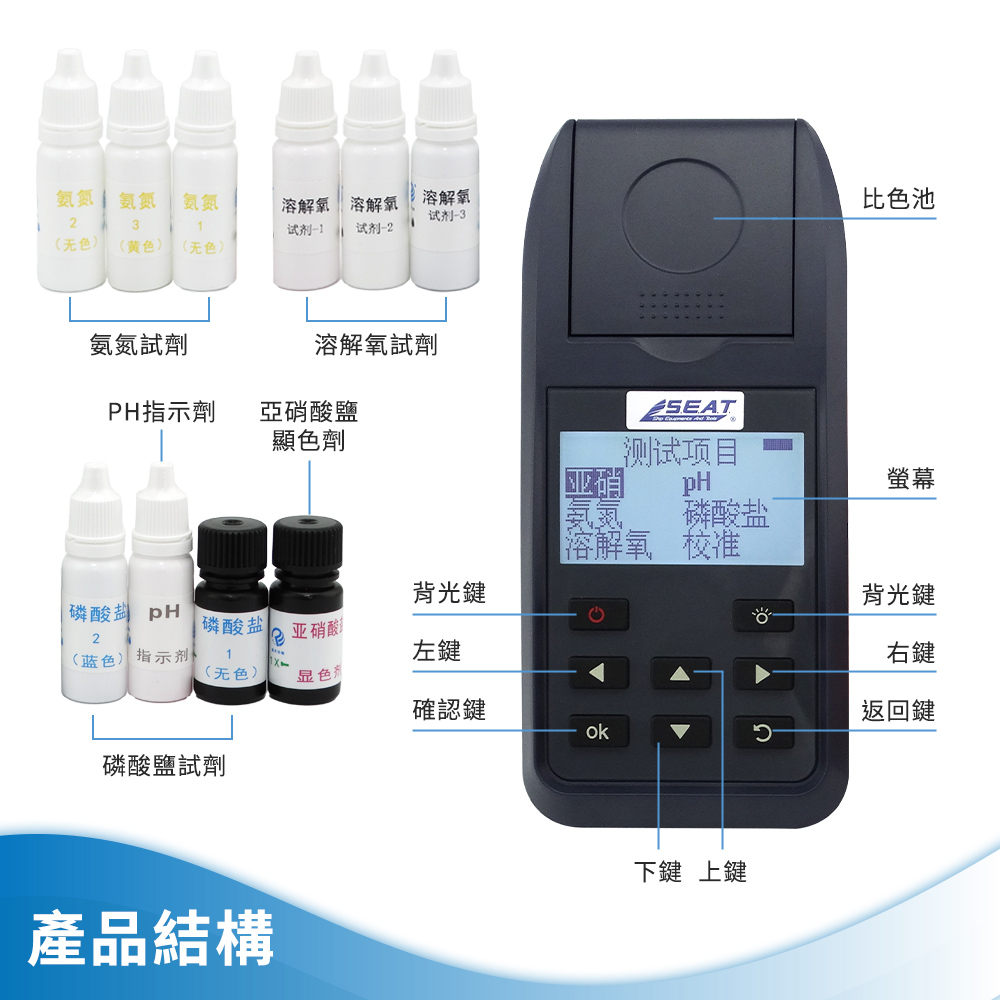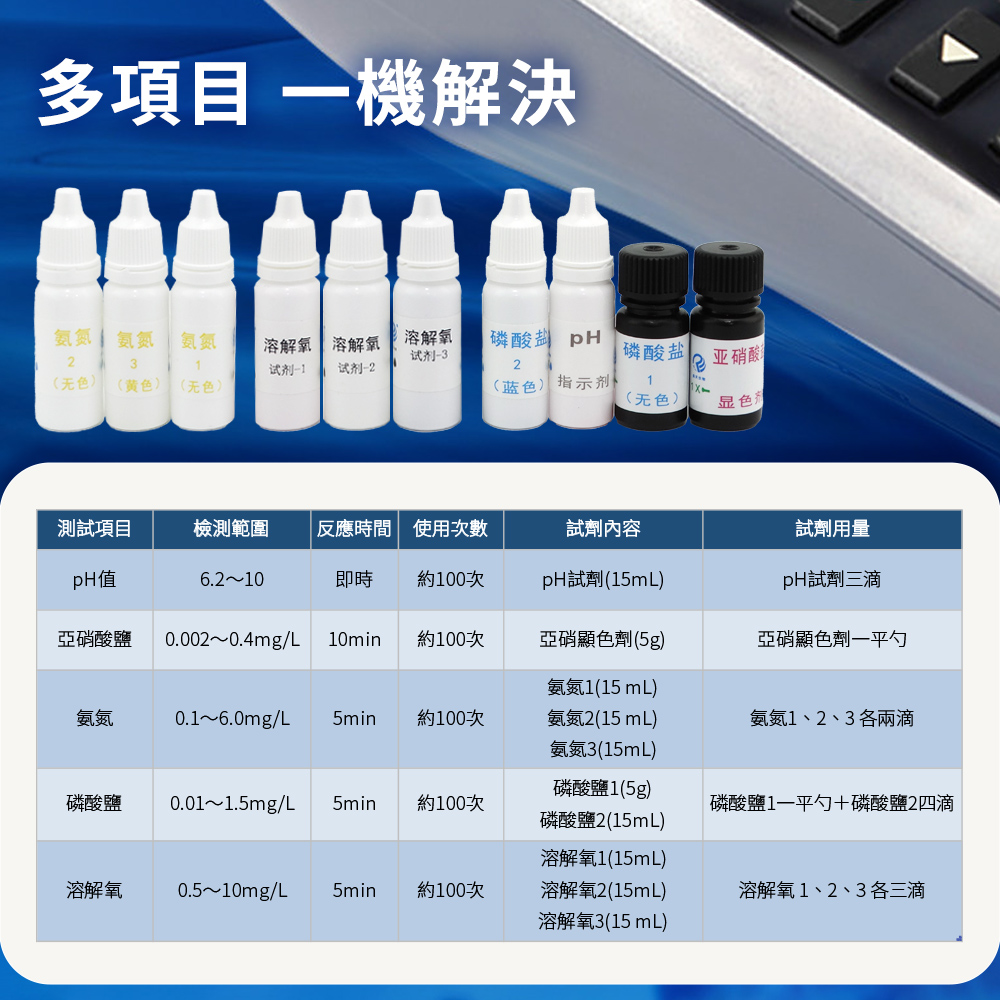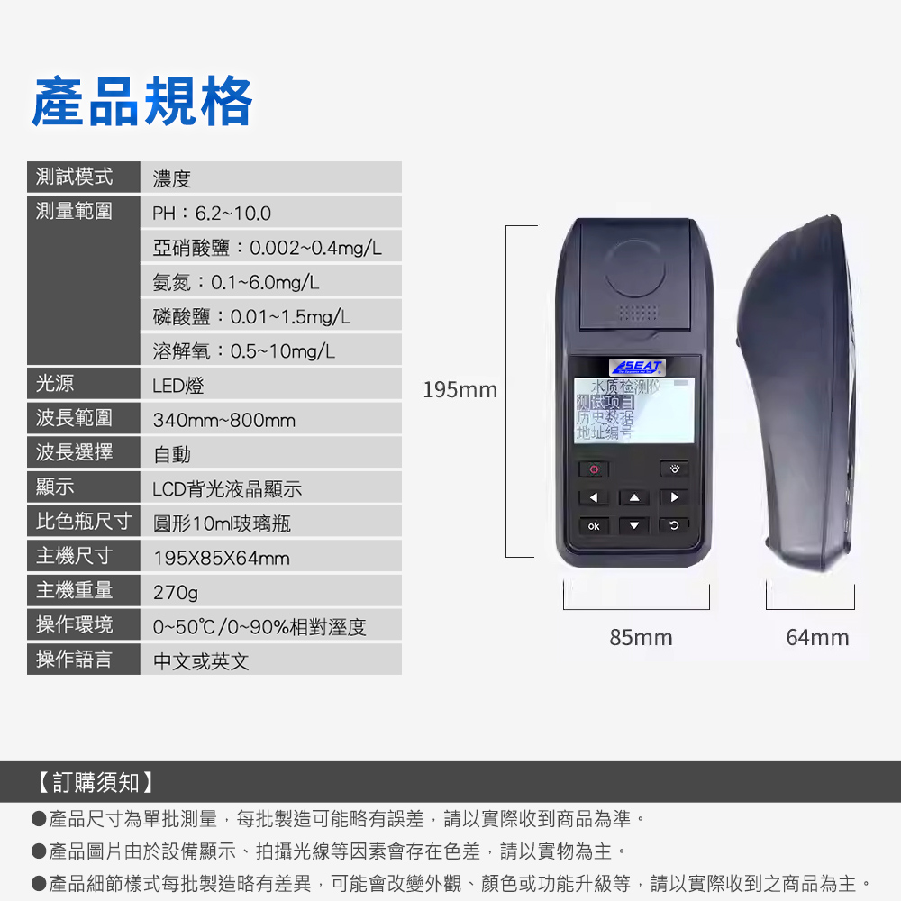 測量範圍:Ph:6.2~10.0 / 亞硝酸鹽:0.002~0.4mg/L / 氨氮:0.1~6.0 mg/L / 磷酸鹽:0.01~1.5 mg/L / 溶解氧:0.5~10 mg/L