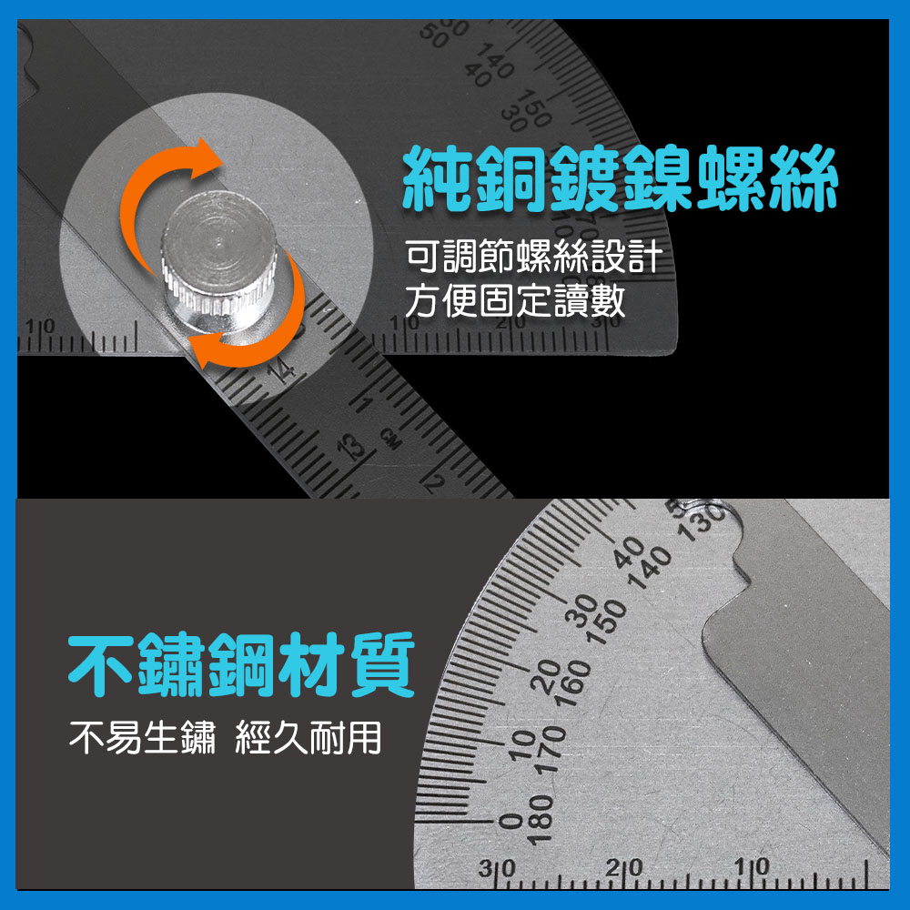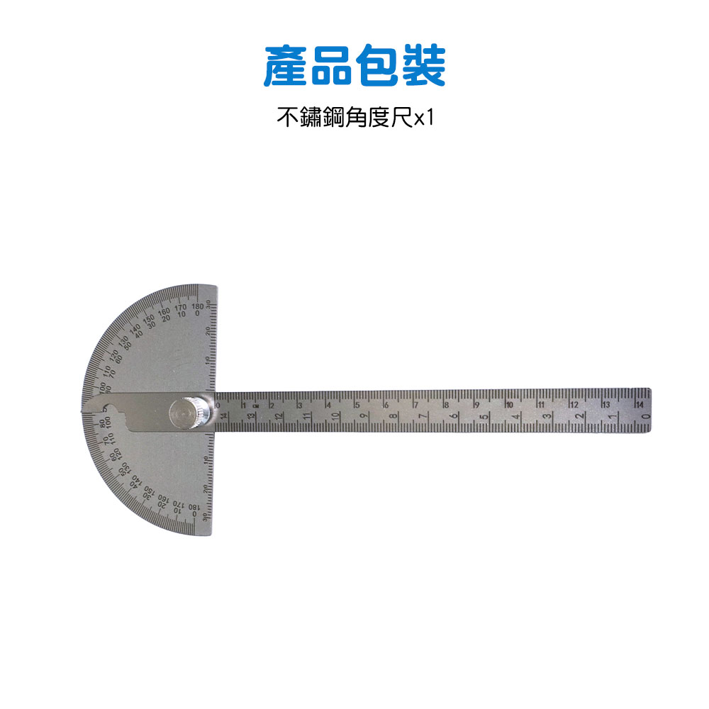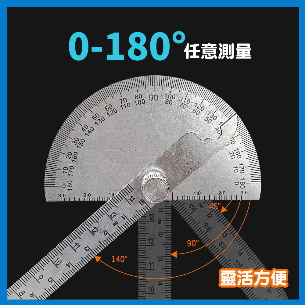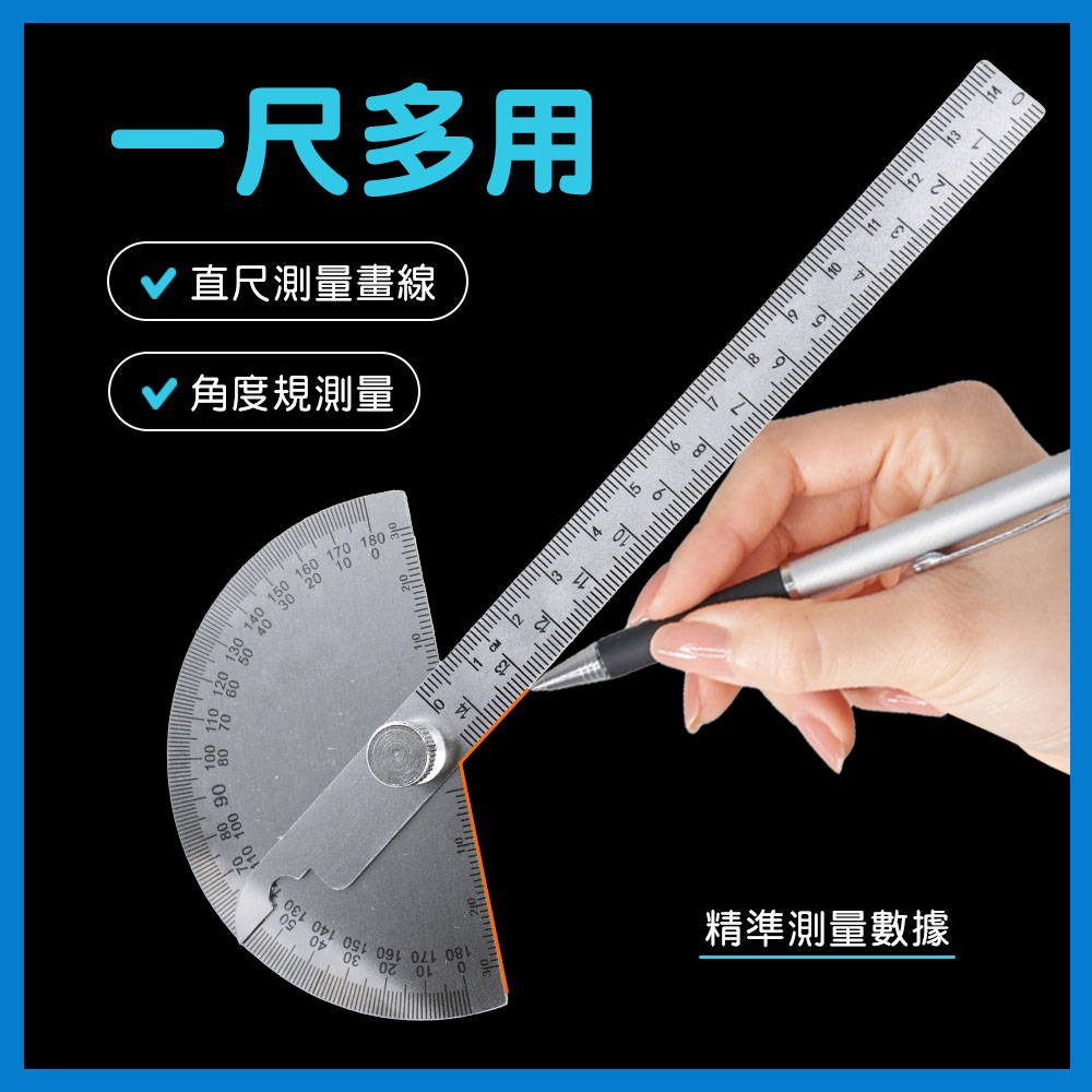 不鏽鋼角度尺,0–180°精準量角,兼具直尺功能。一尺多用、刻度清晰耐磨、防鏽好清潔,是木工與裝修現場必備量測工具。
