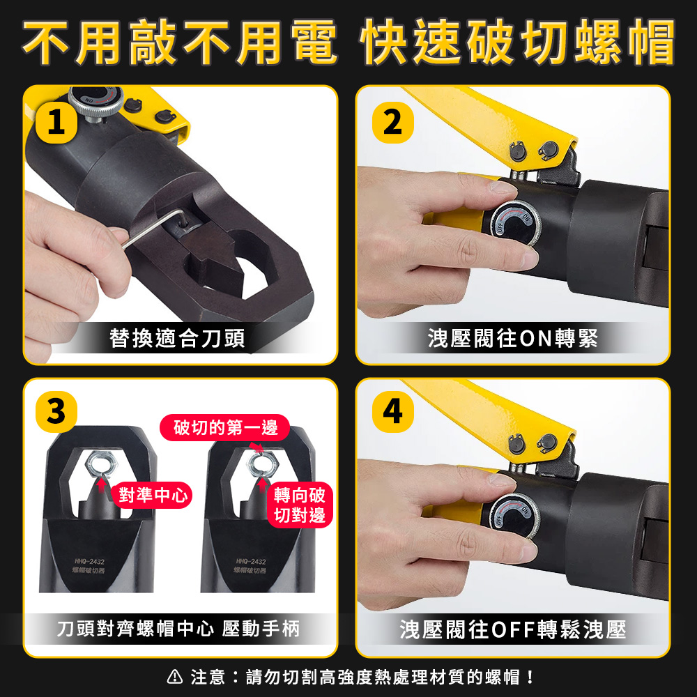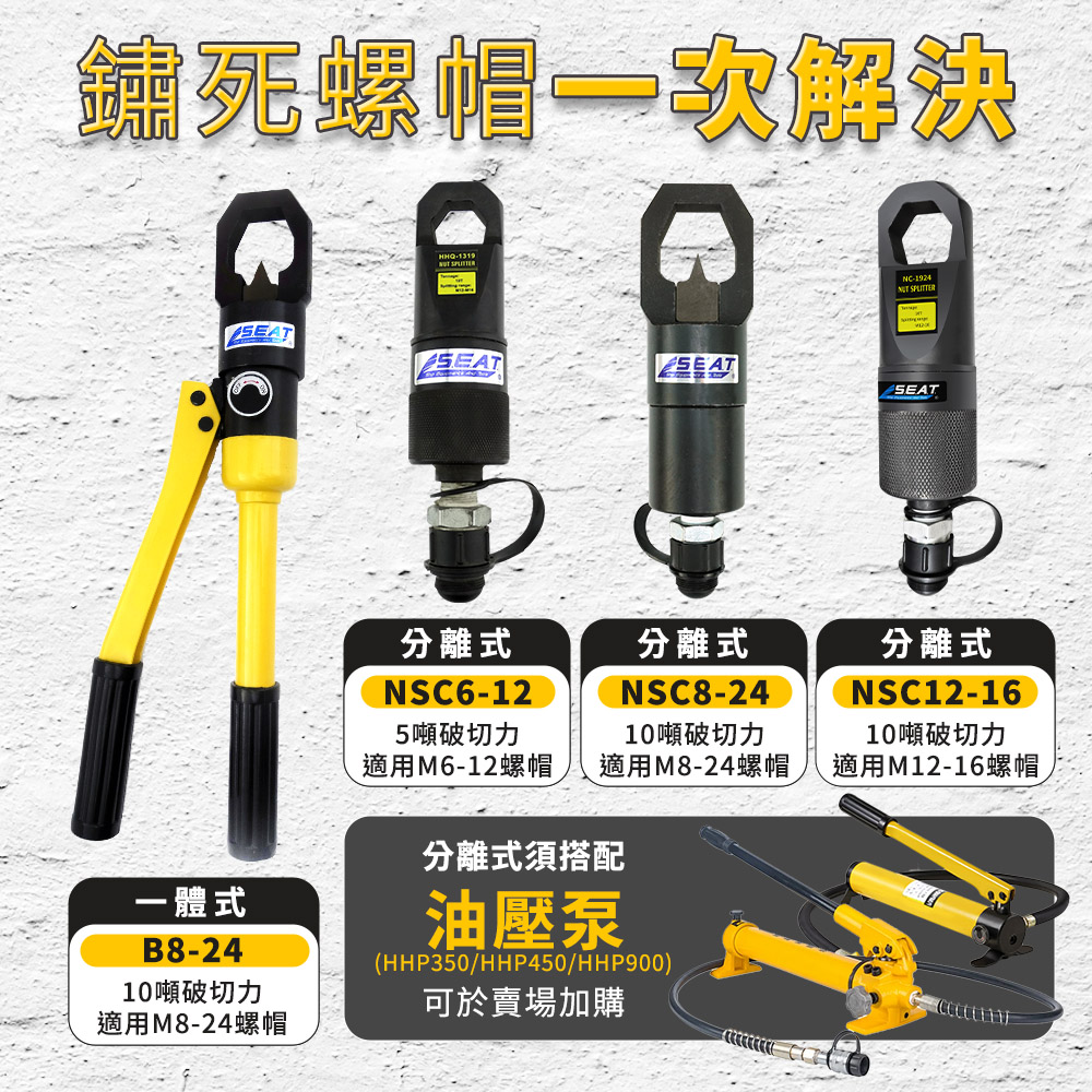 鏽死、滑牙、敲不開?施工現場最怕卡死螺帽拖延工期。一體式液壓螺帽破壞器,10噸強勁破切力,適用M8-M24螺帽,無火花、安全作業,快速對準施壓即可完成破切。附替換刀頭與工具箱,工地維修、設備拆裝、鋼構施工都能輕鬆應對,節省時間、降低人力成本。