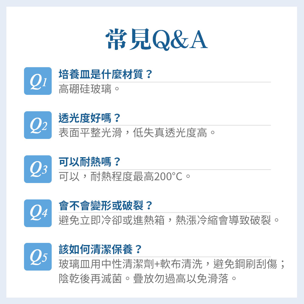 高透明度便於觀察菌落形態、邊緣、生長界線與色澤變化,良好耐化學性對酸、鹼、酒精、多數有機溶劑具穩定性,不易被培養基或消毒劑侵蝕、染色。
