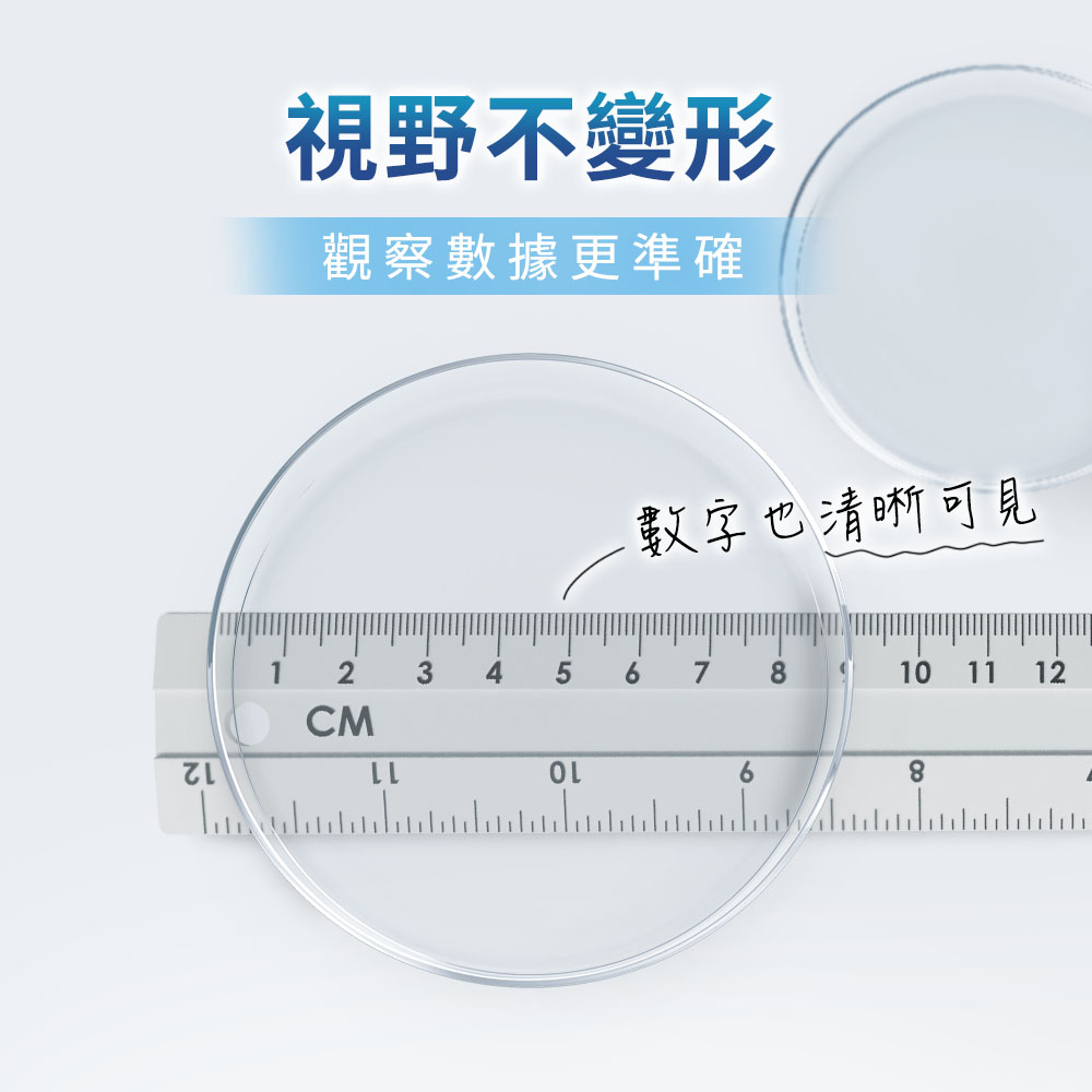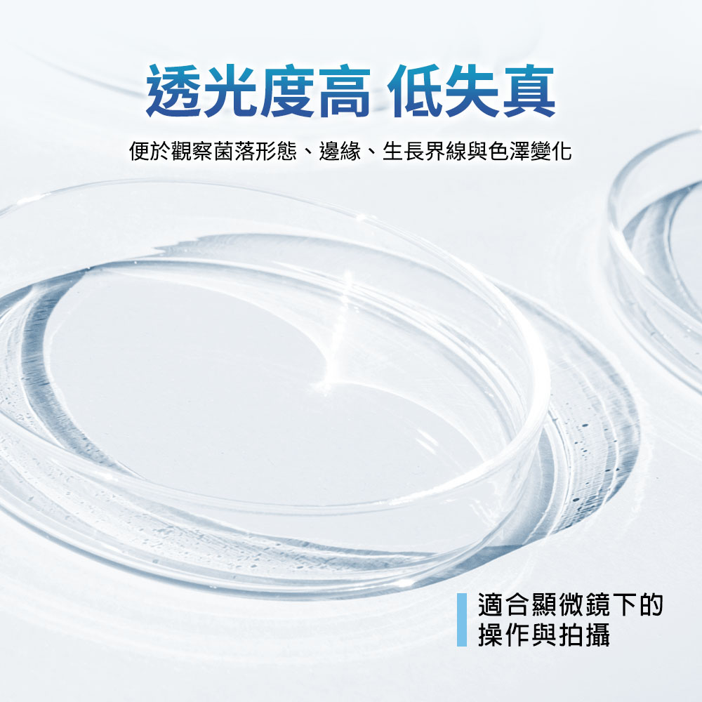 高透明度便於觀察菌落形態、邊緣、生長界線與色澤變化,良好耐化學性對酸、鹼、酒精、多數有機溶劑具穩定性,不易被培養基或消毒劑侵蝕、染色。