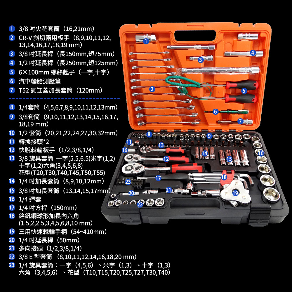 MIT-CRV121 汽保修工具組一次給你 121 件高頻使用規格,涵蓋套筒、棘輪、板手、旋具與專用工具,採用 CRV 不銹合金鋼,耐磨不易變形。搭配 量身訂製手提儀器箱+清楚尺寸標示,拿得到、用得快、收得好,無論汽車保養、設備拆裝或居家維修,一箱就是你的完整解決方案。