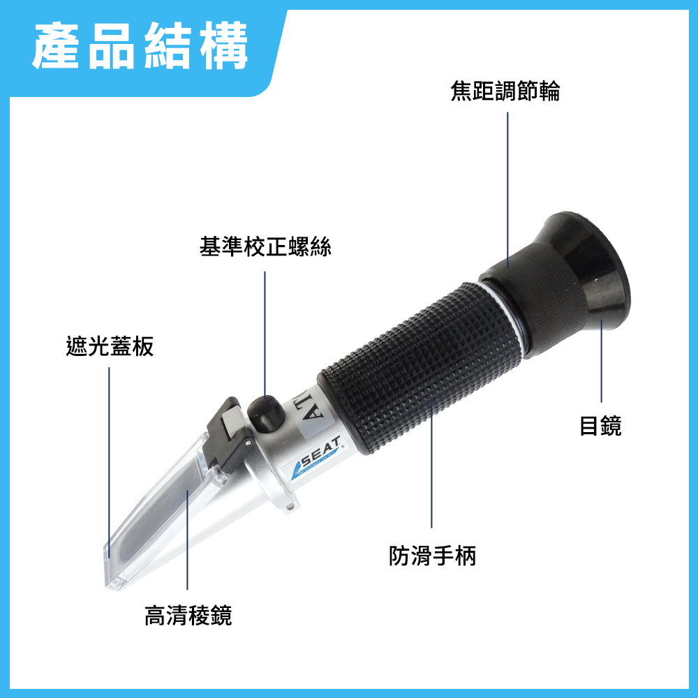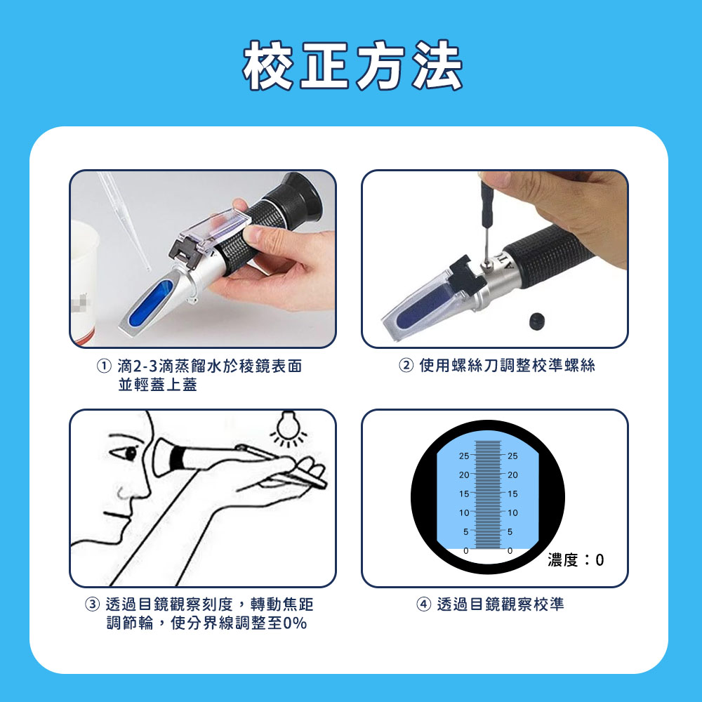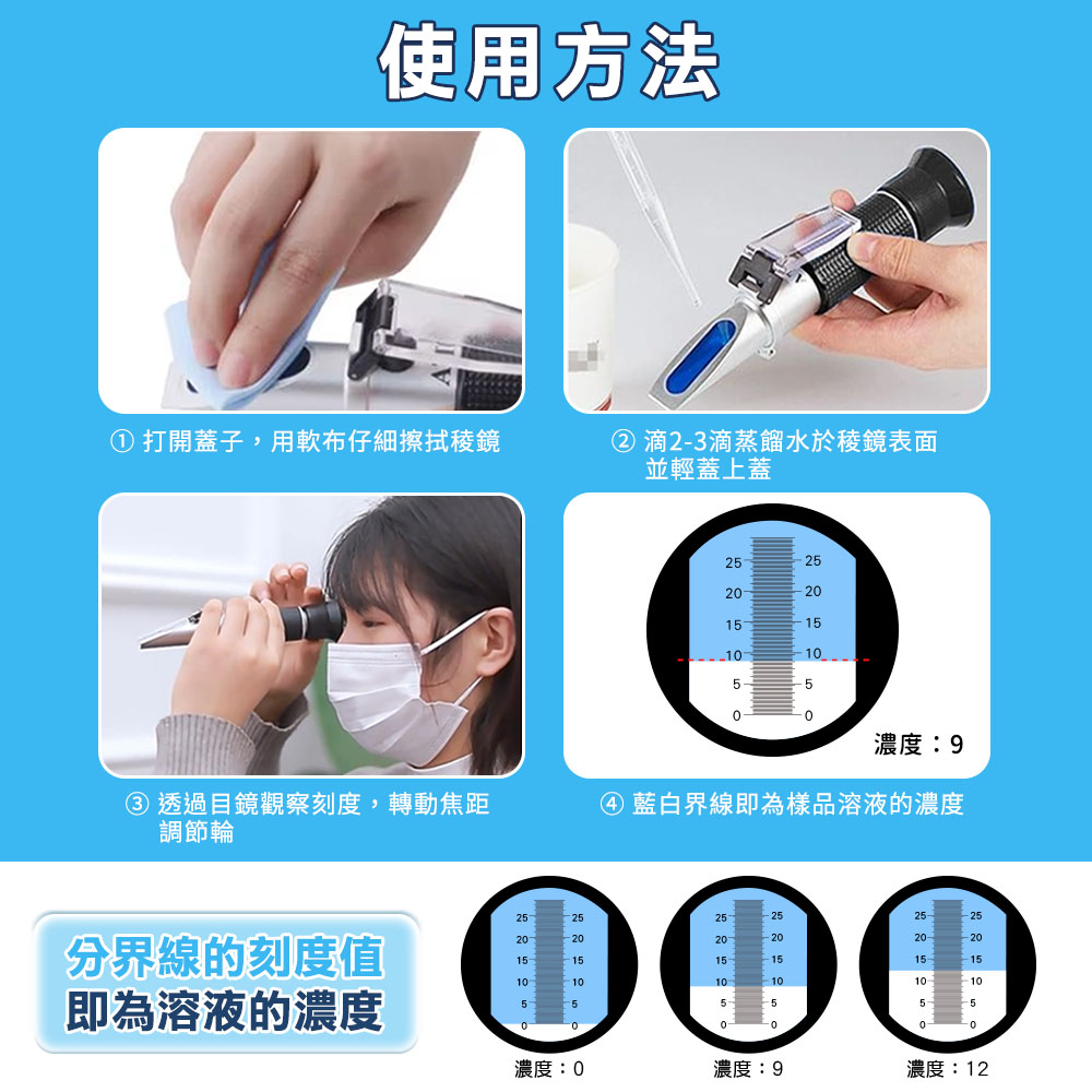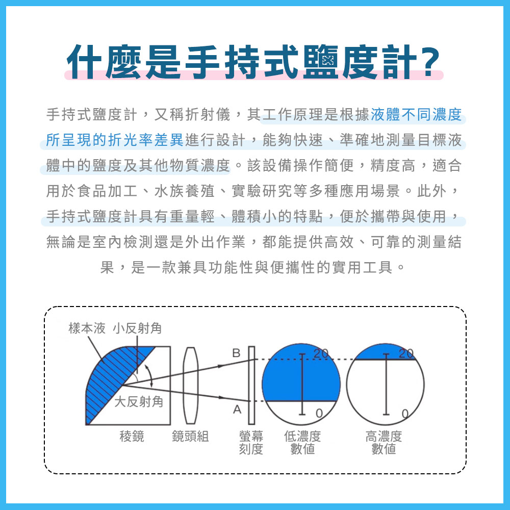 ✔光學折射儀:利用鹽度濃度不同,變更折射原理,可用來測定鹽分含量