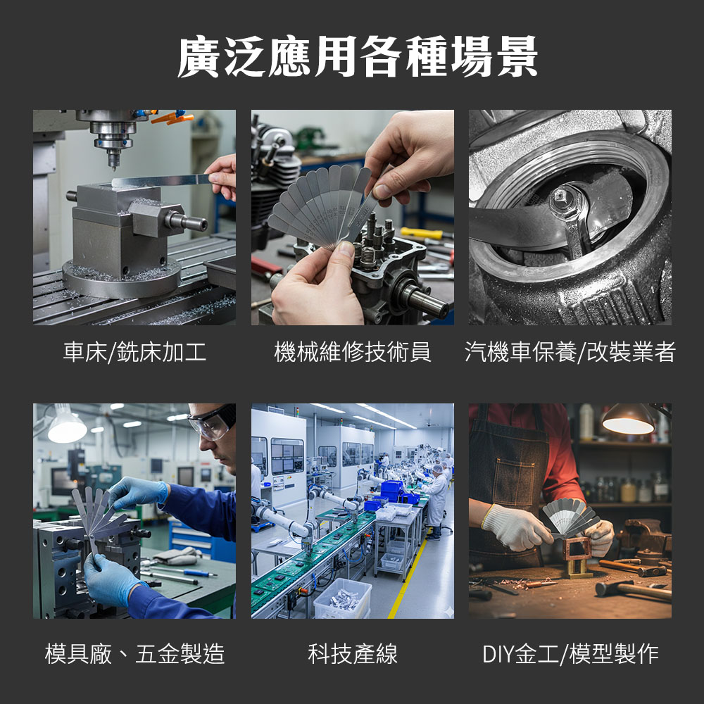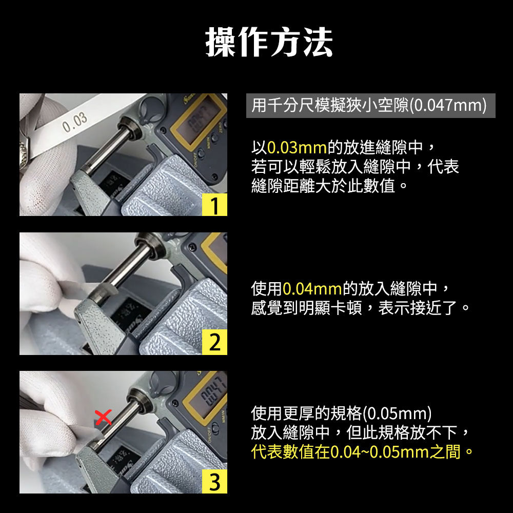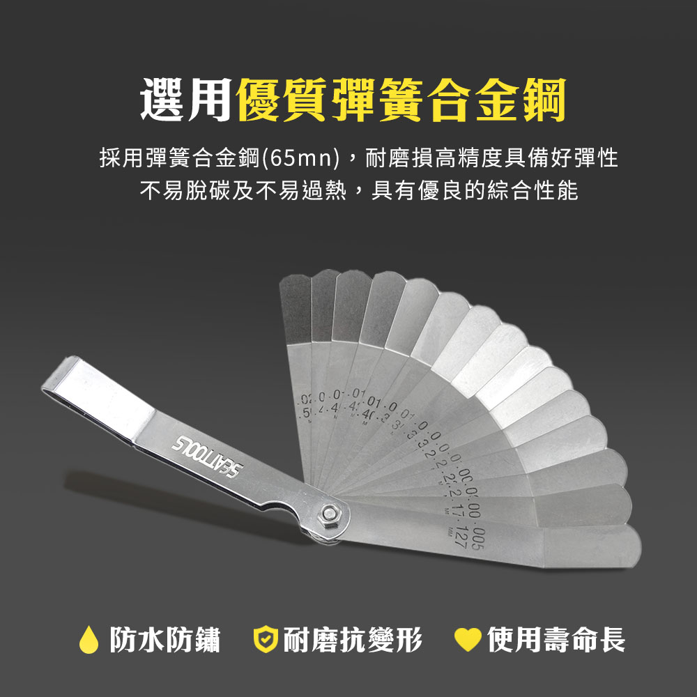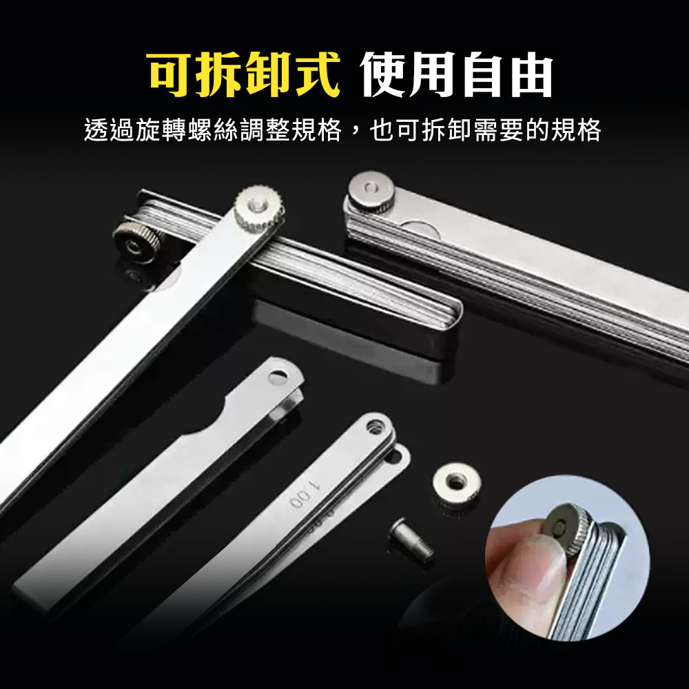 彈簧合金鋼間隙規適用於檢測間隙的測量器之一,使用前請先清除尺和工件表面的汙垢灰塵,表面塗有防鏽油,使尺身不易生鏽,可左右旋轉360°,使用方便。