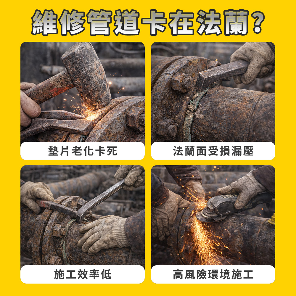 法蘭鏽死、墊片老化卡死、空間狹窄難施工?傳統敲打不但效率低,還可能傷及法蘭面。分離式法蘭撐開器,8噸輸出力、最大張開18公分,快速、安全、可控分離。適用管線維修、閥門更換、設備保養,高風險環境施工更安心,是石化、電力、工廠維修必備專業工具。