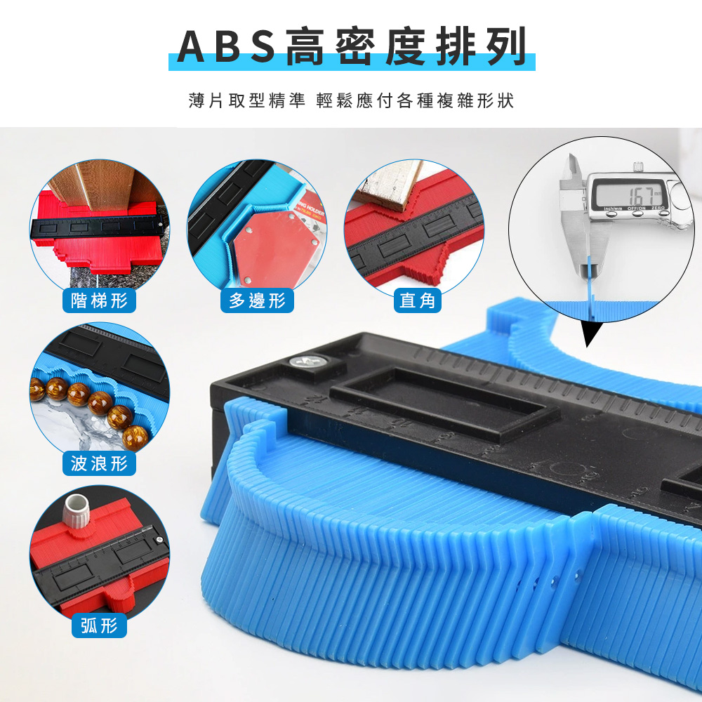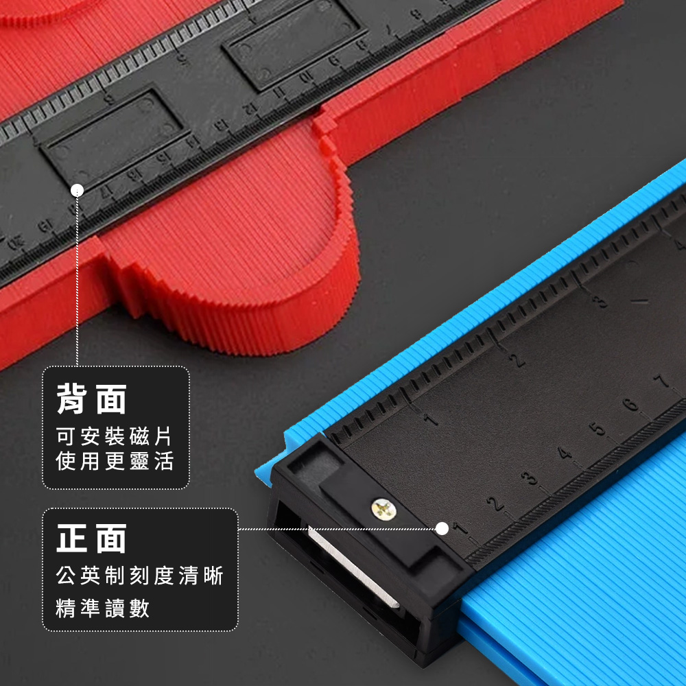 在裝潢施工、磁磚切割、木工裁切時,最麻煩的就是不規則形狀難以測量,一旦量錯就得重做。輪廓仿形規透過高密度對稱條設計,只需輕壓貼合物件表面,就能快速複製輪廓形狀,搭配公共刻度尺,測量與標記一次完成。ABS耐用材質不易變形,適用木工、磁磚、管道施工、裝潢工程等多種場景,是專業施工與DIY必備測量工具。