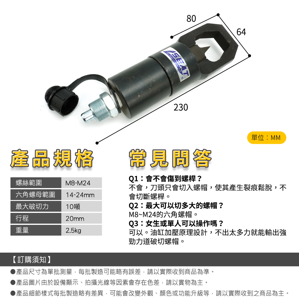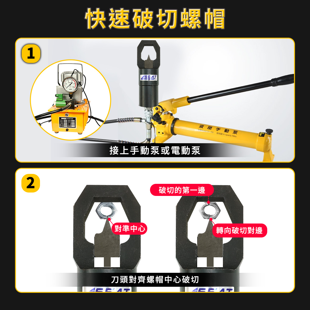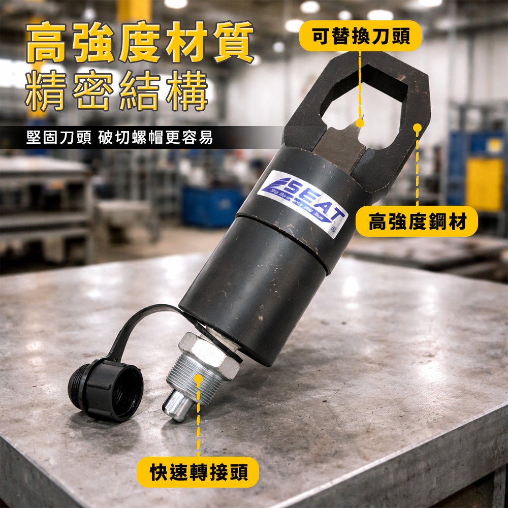 鏽死、滑牙、敲不開?施工現場最怕卡死螺帽拖延工期。分離式液壓螺帽破壞器,10噸強勁破切力,適用M8-M24螺帽,無火花、安全作業,快速對準施壓即可完成破切。工地維修、設備拆裝、鋼構施工都能輕鬆應對,節省時間、降低人力成本。