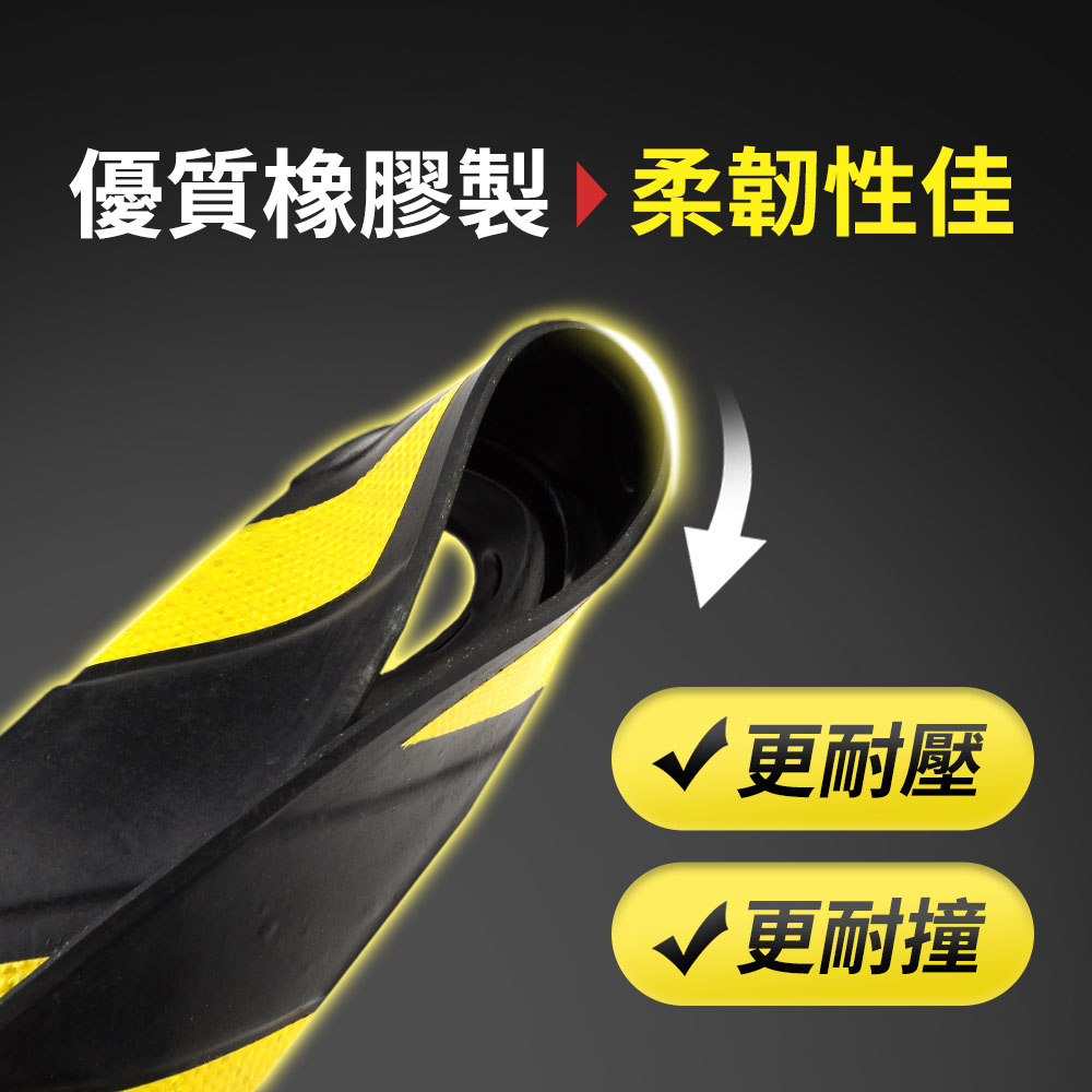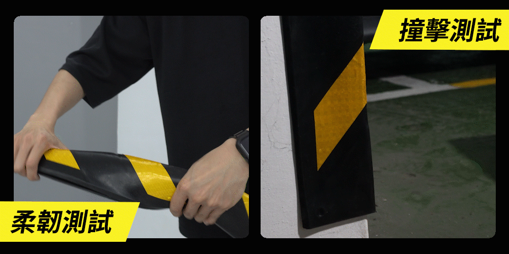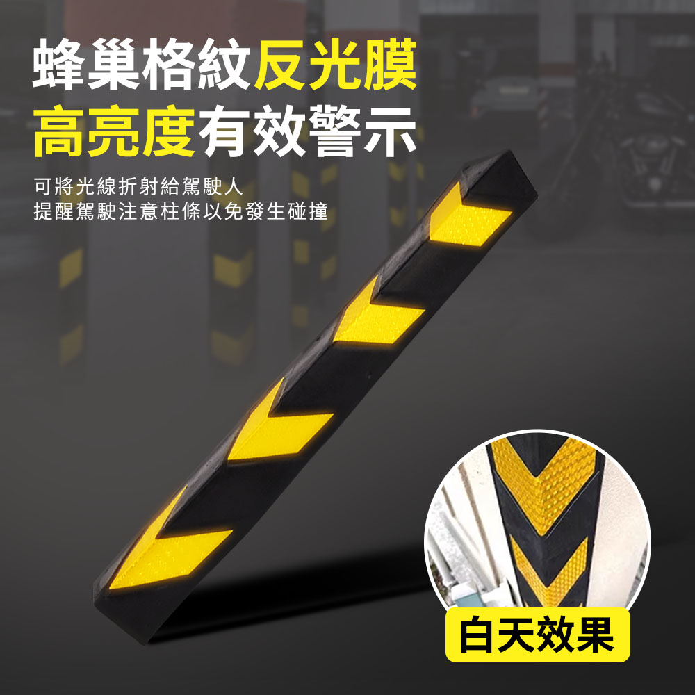 停車場防護條外觀黑黃相間,蜂巢格紋反光膜,可將光線折射給駕駛人,提醒駕駛注意柱條,以免發生碰撞。整體使用優質橡膠製成,柔韌性極佳,耐撞耐彎折,有效減少車輛直接碰撞造成的損害。