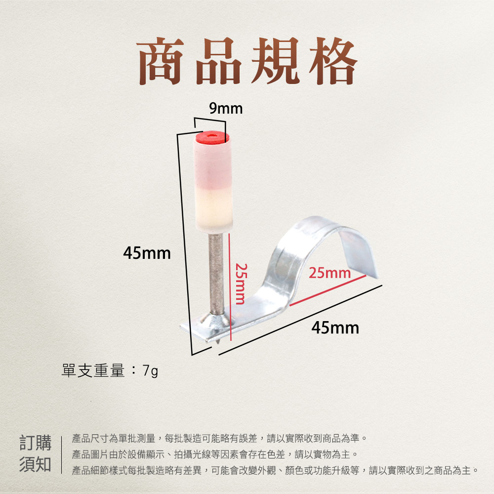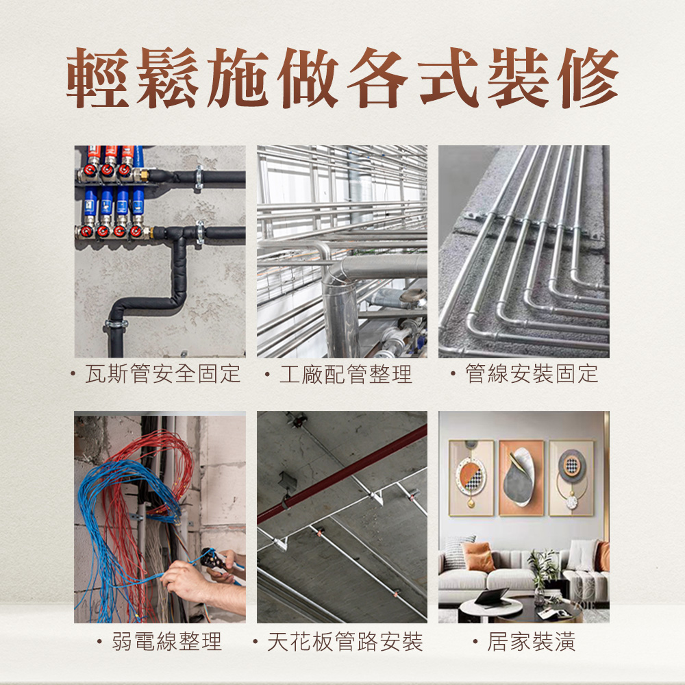管線亂七八糟、垂掛又危險?一顆管卡釘就搞定!穩固固定電線管、給水管、瓦斯管與各式軟管,讓牆面、天花板管路排列整齊不位移,施工快速、省時又安全,是水電師傅與裝修現場必備的小五金。