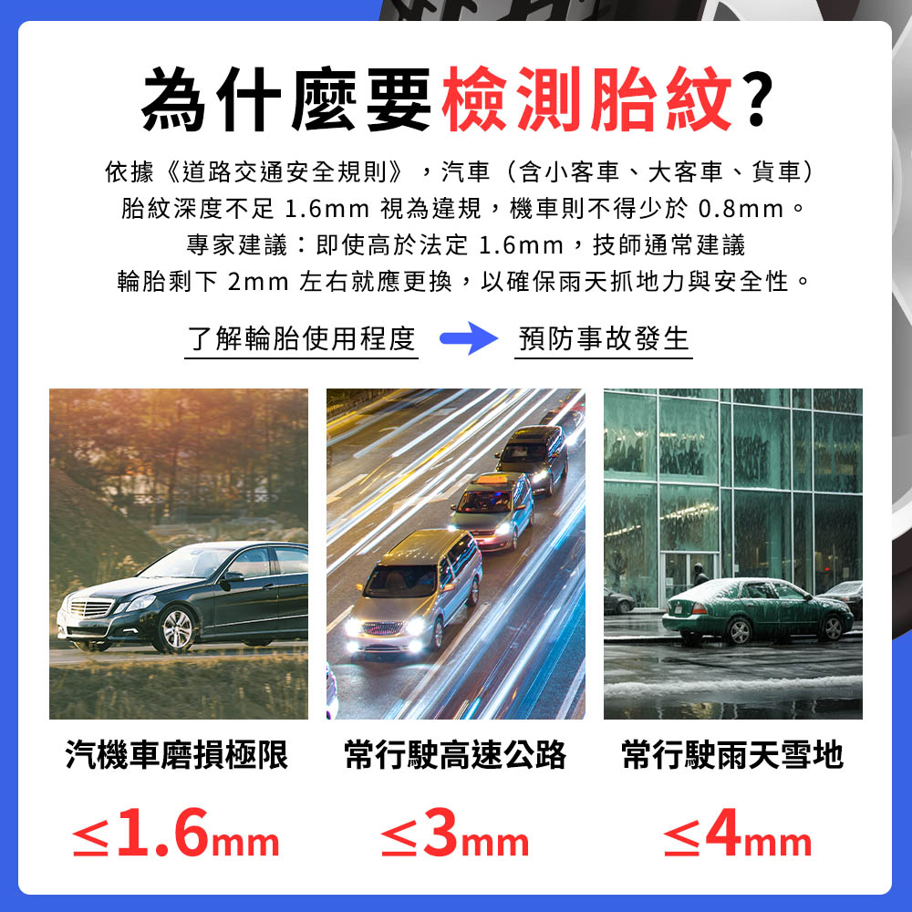 胎紋深度定期檢測:汽車輪胎胎紋深度要超過「1.6mm」才安全