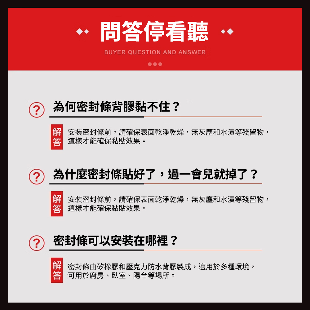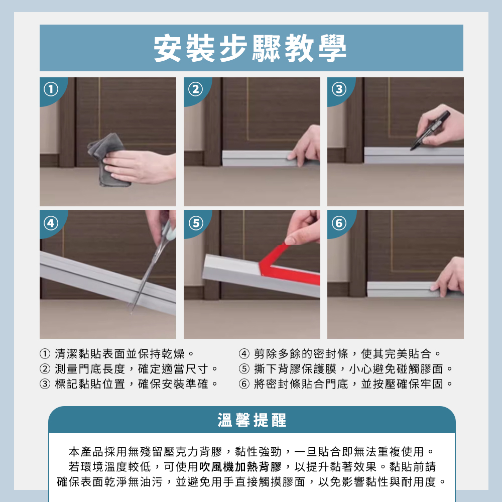 門縫密封條由矽橡膠與壓克力背膠製成,適用於填補門與門框間的縫隙,防止風沙、灰塵、冷氣外洩和噪音進入。高黏性背膠確保牢固黏貼,適合光滑表面使用。安裝前請確保表面乾淨乾燥,如環境過冷可輕微加熱增強黏性。