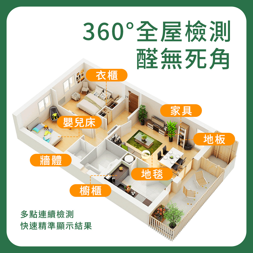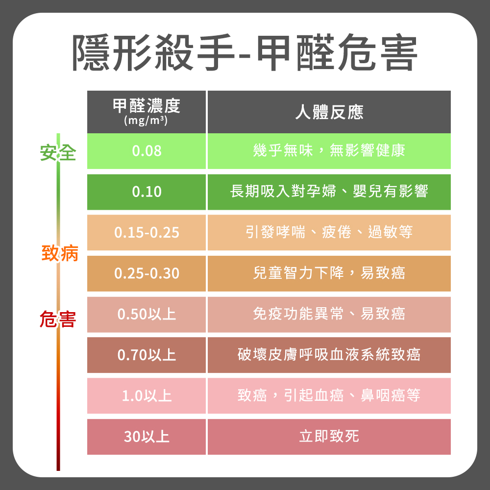 • 母嬰級安全提示:偵測結果低於0.05mg/m³,即符合母嬰入住標準。
