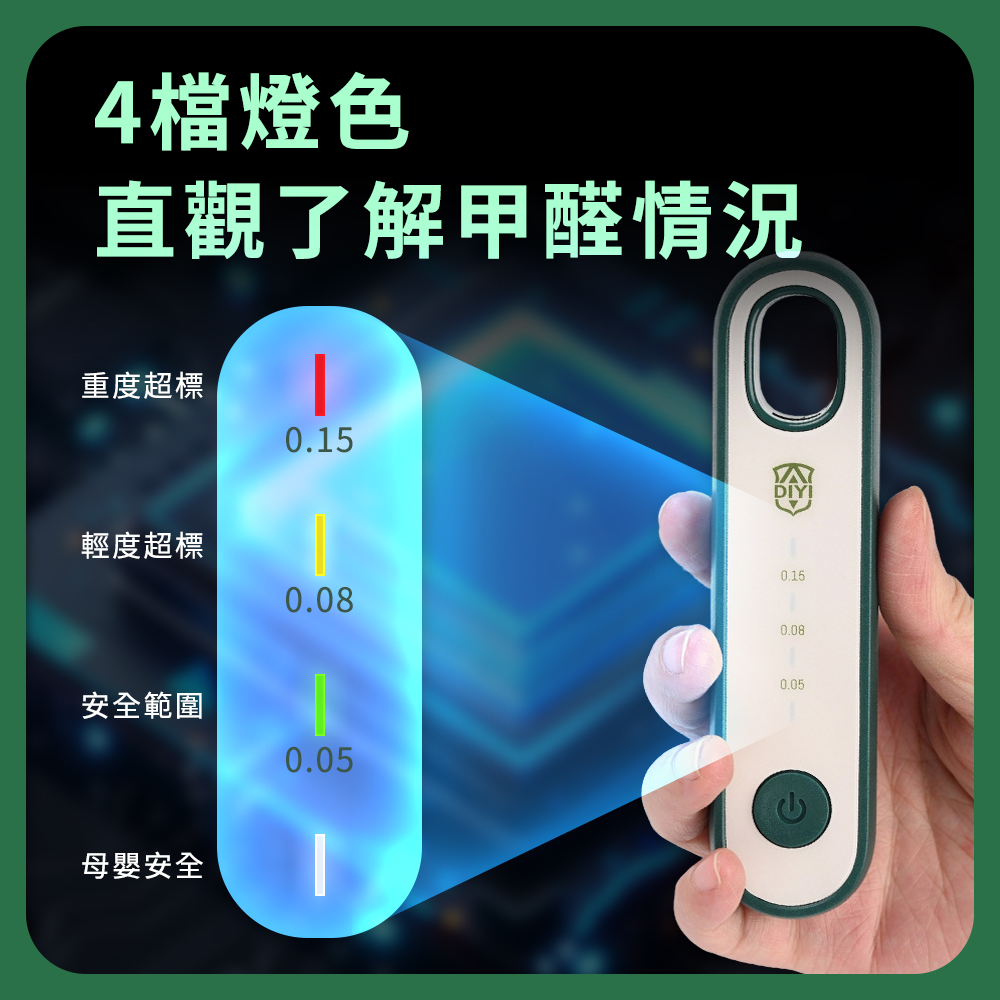• 四色燈號即時顯示:白色(母嬰安全)、綠色(安全)、黃燈(輕度超標)、紅燈(重度超標)。