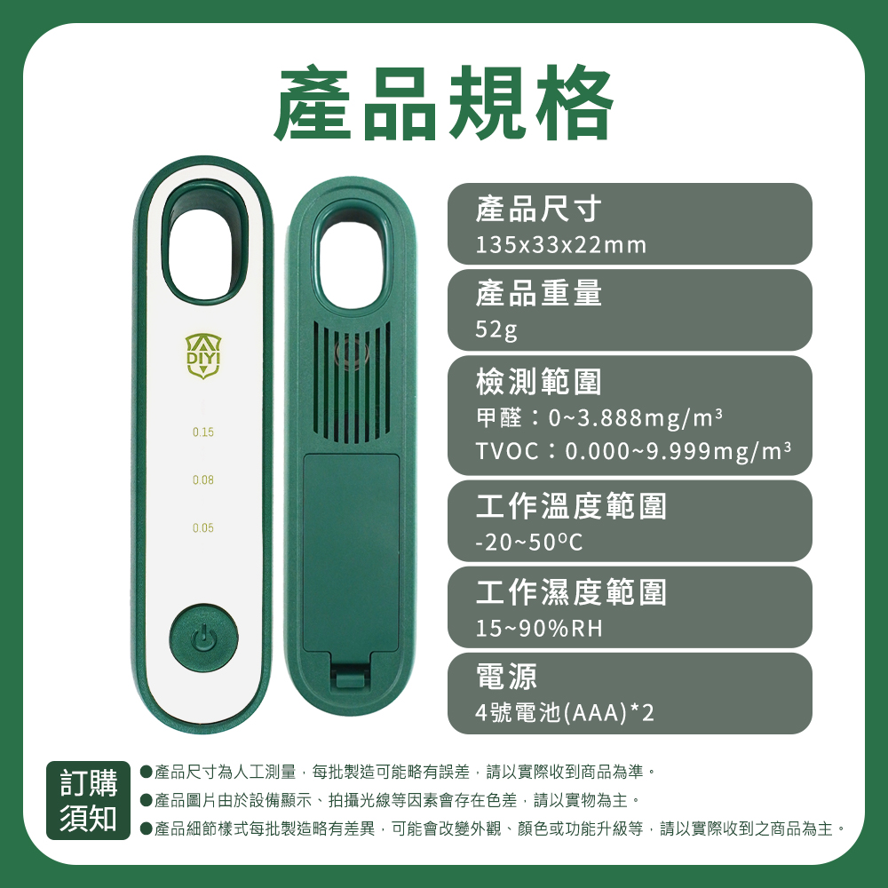 • 檢測範圍:甲醛:0 ~ 3.888 mg/m³ TVOC:0.000 ~ 9.999 mg/m³