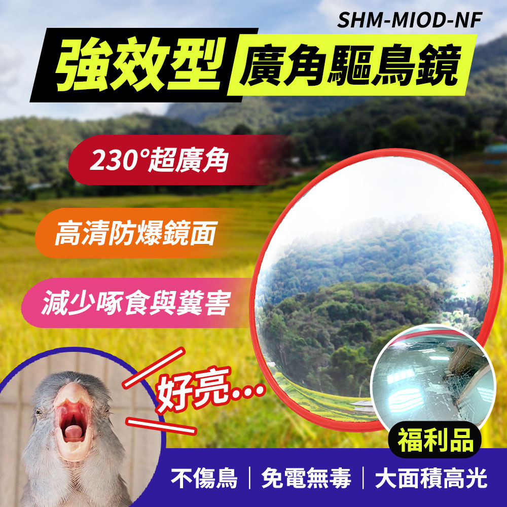 讓鳥害退散、收成更安心!「強效型廣角驅鳥鏡 SHM-MIOD-NF」以230°超廣角與大面積高光反射,在日照下形成強烈視覺干擾,有效降低啄食與築巢。鏡面採高清防爆 PC,受壓可回彈、不易破裂;ABS 外殼抗 UV、防水,長期戶外部署不褪色。免電、無毒、零維護,搭配彈簧扣或細鋼索懸掛可微幅擺動,進一步提升驅離效果。