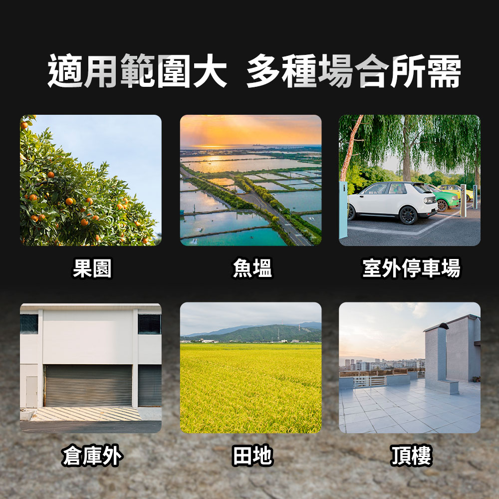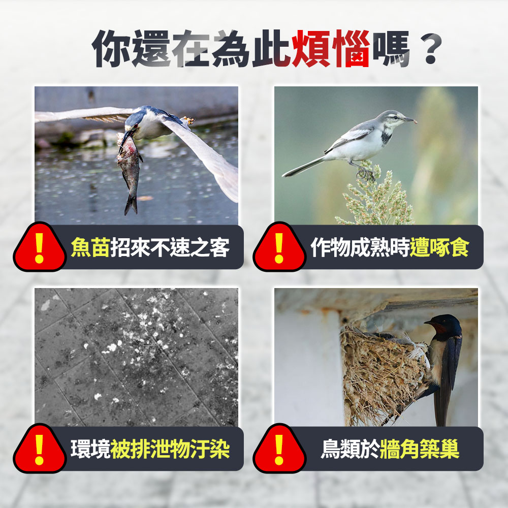 適用於:果園、田地、魚塭、溫室、停車棚/屋簷等場域,安裝簡單、範圍覆蓋廣,不傷鳥更環保。用一面鏡,守住你的產量與場域整潔。