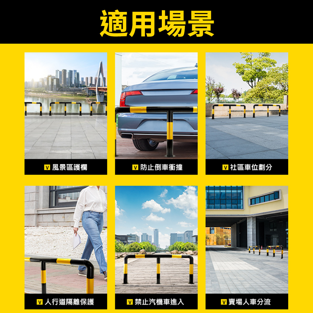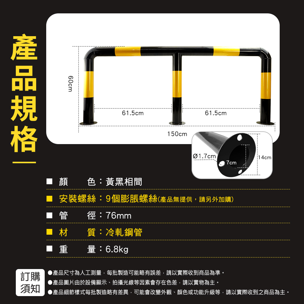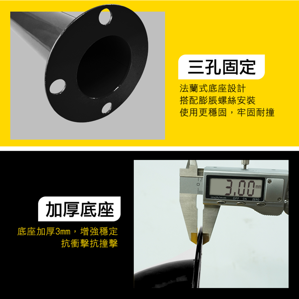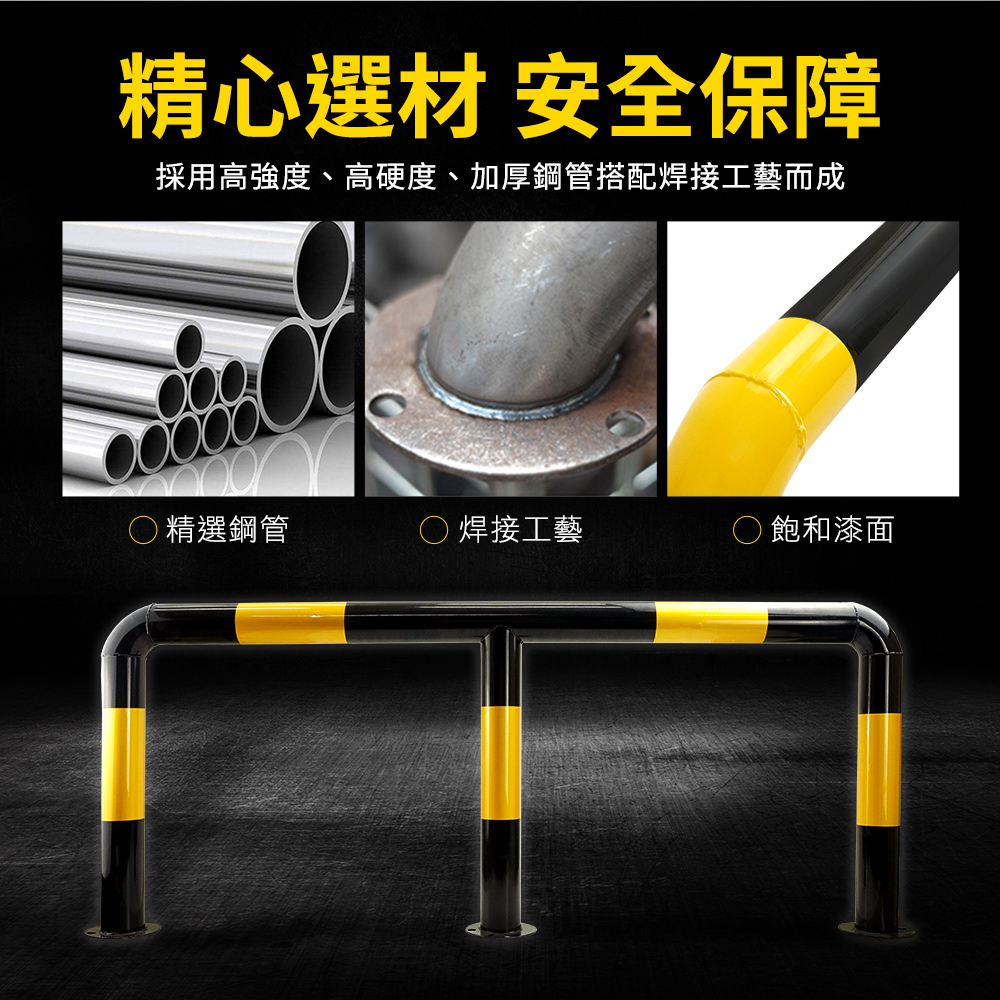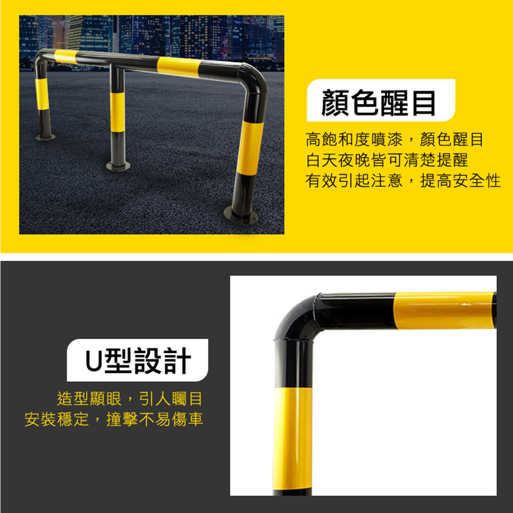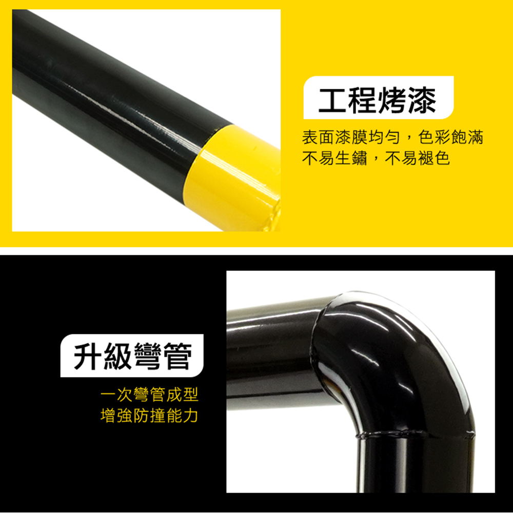 產品採用全新冷軋鋼管材質製作,滿焊焊接工藝,符合力學結構要求,密封好焊接強度加大更加美觀,表面工程烤漆,漆膜均勻,色彩飽滿不易生鏽。M型設計造型顯眼,容易引人注目,底部安裝9顆膨脹螺絲,可穩穩牢固在地面,受到車輛撞擊時可減少傷害。