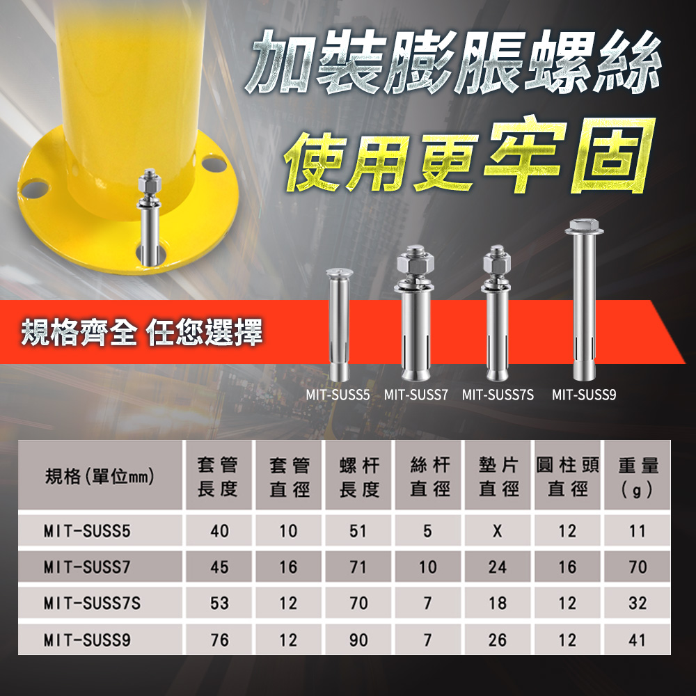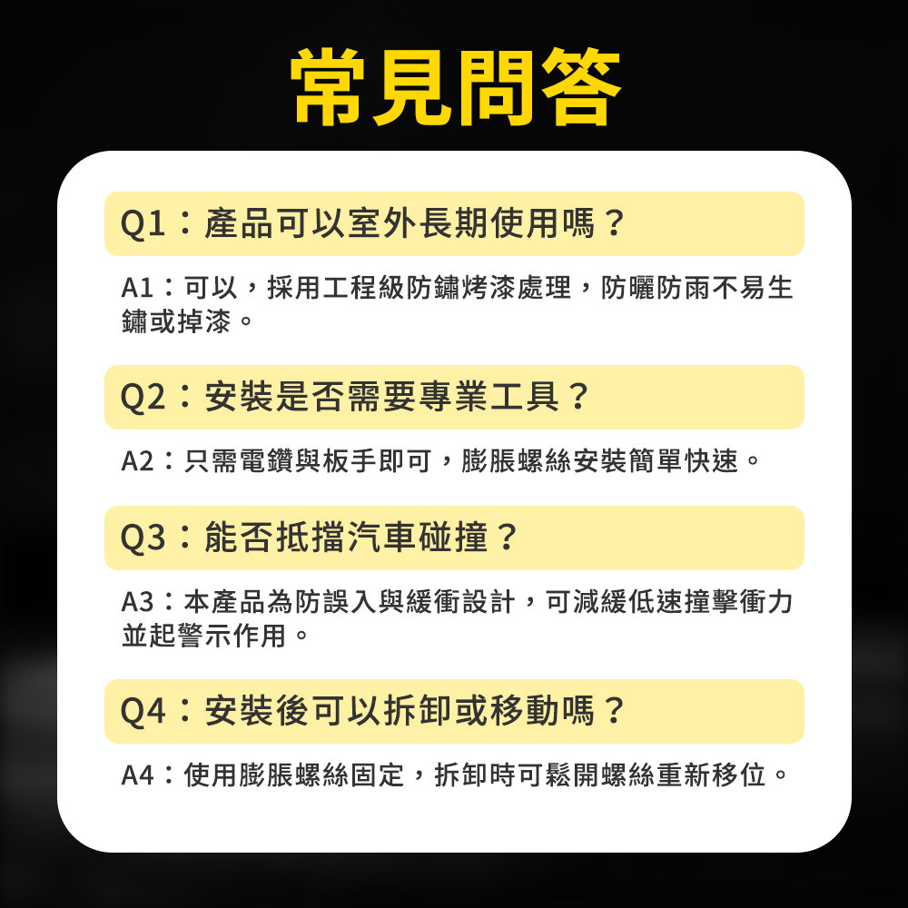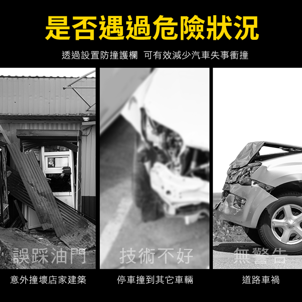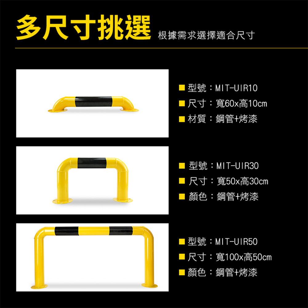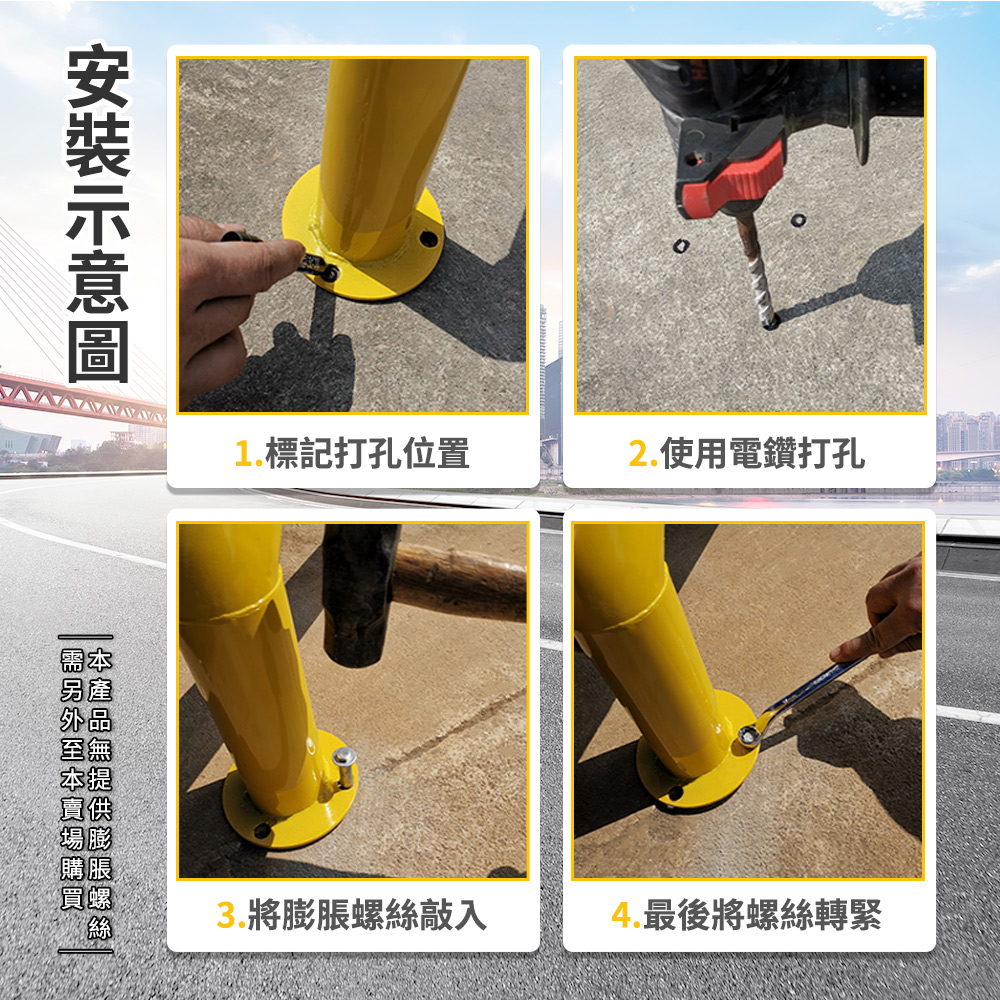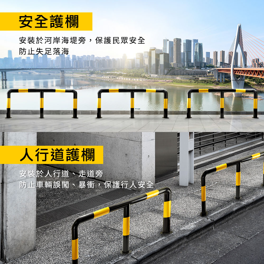 產品採用全新冷軋鋼管材質製作,滿焊焊接工藝,符合力學結構要求,密封好焊接強度加大更加美觀,表面工程烤漆,漆膜均勻,色彩飽滿不易生鏽。M型設計造型顯眼,容易引人注目,底部安裝9顆膨脹螺絲,可穩穩牢固在地面,受到車輛撞擊時可減少傷害。