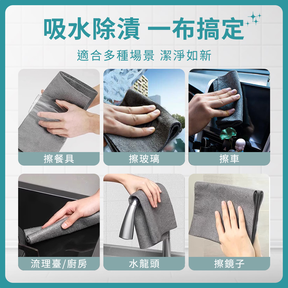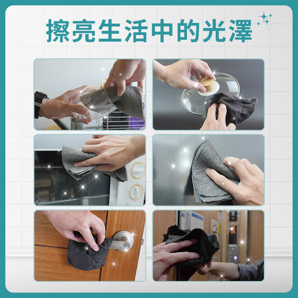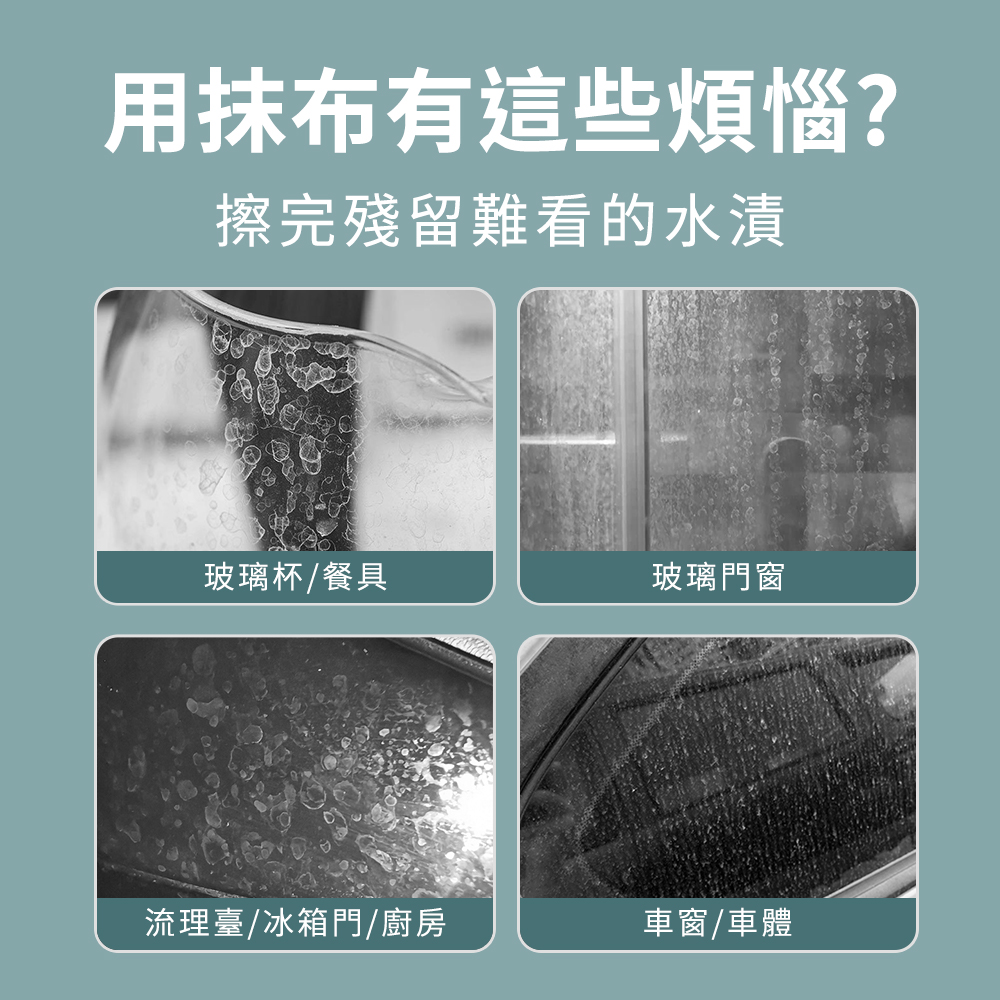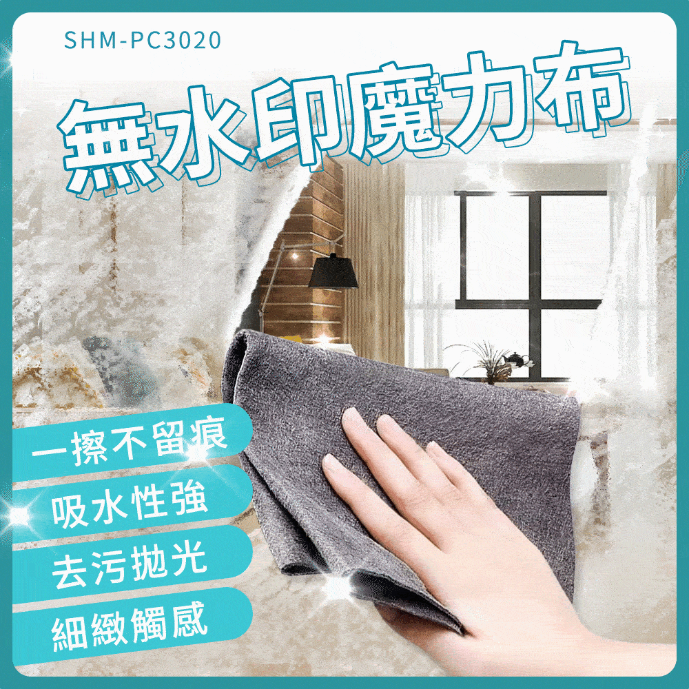 雖然外型不起眼,但卻有令人驚豔的潔淨力,生活中殘留在玻璃杯、餐具、冰箱、流理臺、門窗等,原本該是光澤透亮的亮面卻卡上一層難看的水漬、水垢,有了無水印魔力布,讓您一擦即亮,還給您原有光澤透亮的生活。